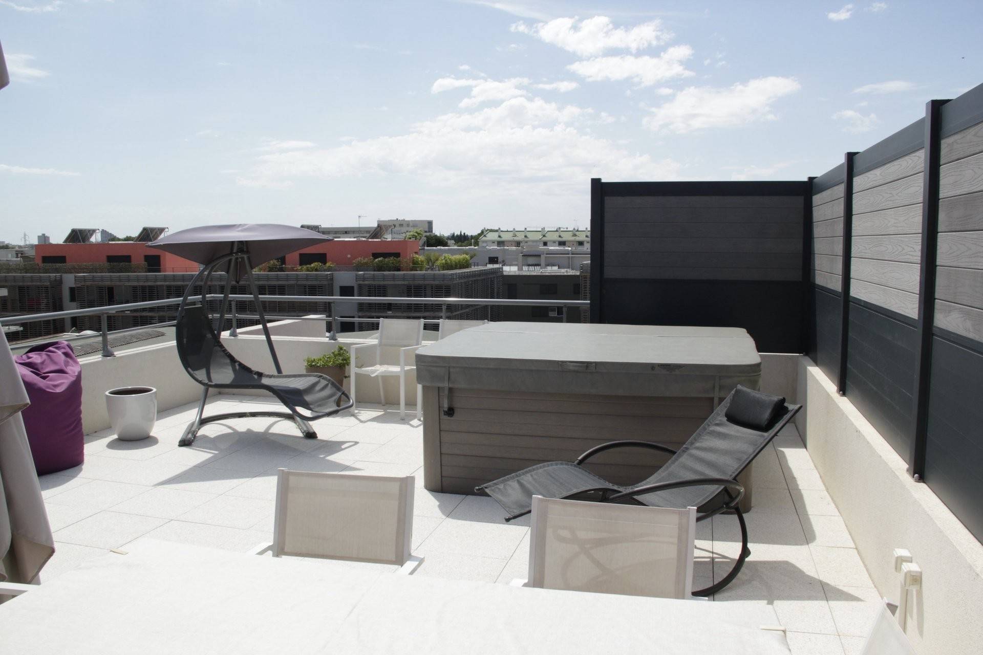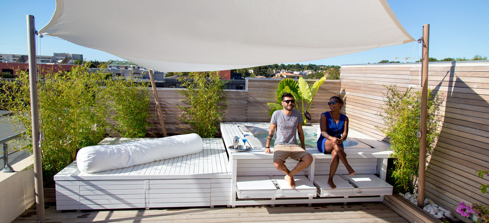 Avant. Ce toit-terrasse de 200 m² manquait de chaleur malgré le soleil montpelliérain. Pour sa rénovation, les propriétaires ont fait appel au paysagiste Damien Aury de Garden Party. L’idée était de redonner une place centrale au Jacuzzi en améliorant son accès et son intégration, mais également de cacher les dalles gravillonnées d’origine, jugées peu esthétiques et, in fine, d’apporter de l’ombre à l’espace pour le rendre agréable à pratiquer.