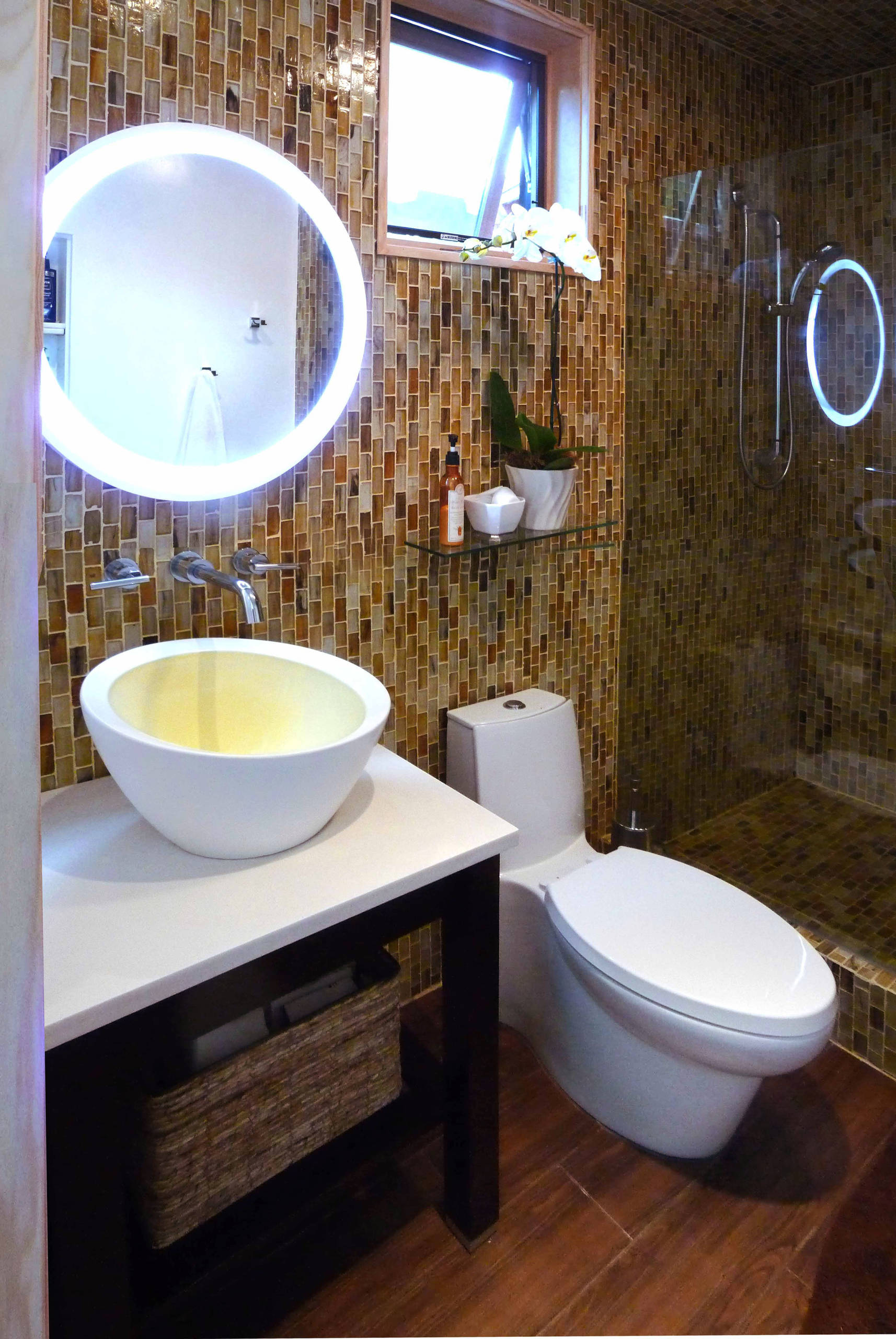 Le néon a également cela d’intéressant qu’il peut se décliner en différentes formes. Ici, il a été utilisé pour épouser le contour d’un miroir circulaire dans une salle de bains. Un choix idéal pour se maquiller ou prendre soin de sa peau sans glace grossissante.