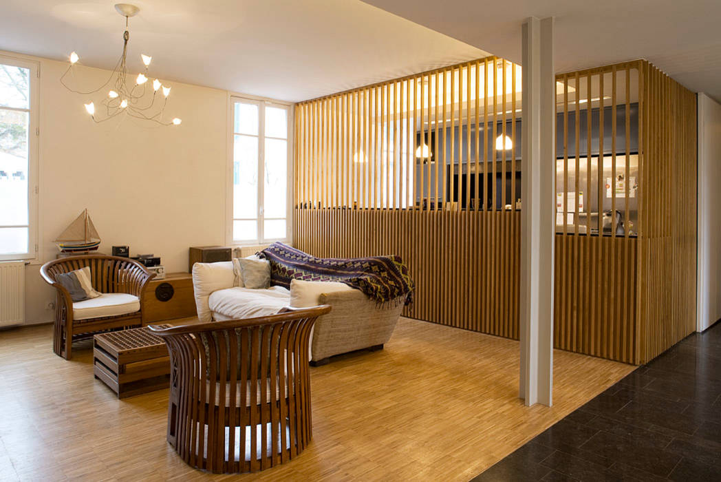 Fermée en partie basse, afin d’installer placards et plan de travail, elle est constituée ici de lames de bois verticales qui, selon l’endroit où l’on se trouve, laissent plus ou moins à voir. Cet aménagement peut être en bois brut ou peint en blanc, selon qu’on le souhaite présent ou plus discret dans la pièce.