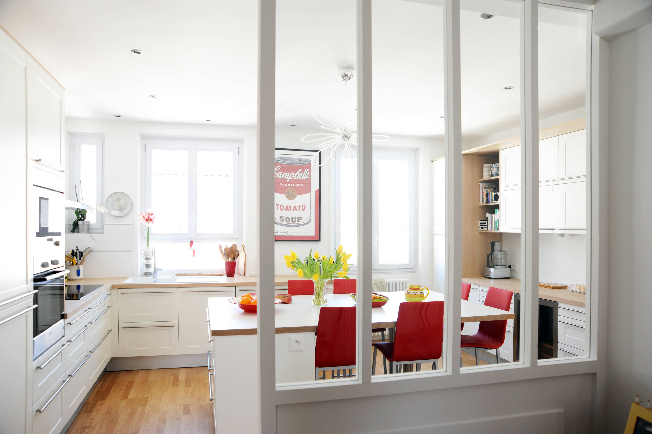 Tout d’abord, il faut bien identifier les raisons qui vous poussent à vouloir fermer l’espace cuisine : est-ce par manque de rangements, par désir d’intimité, par envie de recréer un espace indépendant ? Il y a autant de questionnements que de lieux de vie. Si vous souhaitez pouvoir vous isoler et délimiter les espaces sans pour autant cloisonner avec des plaques de plâtre, optez pour une séparation semi-opaque qui laissera passer la lumière et circuler le regard.