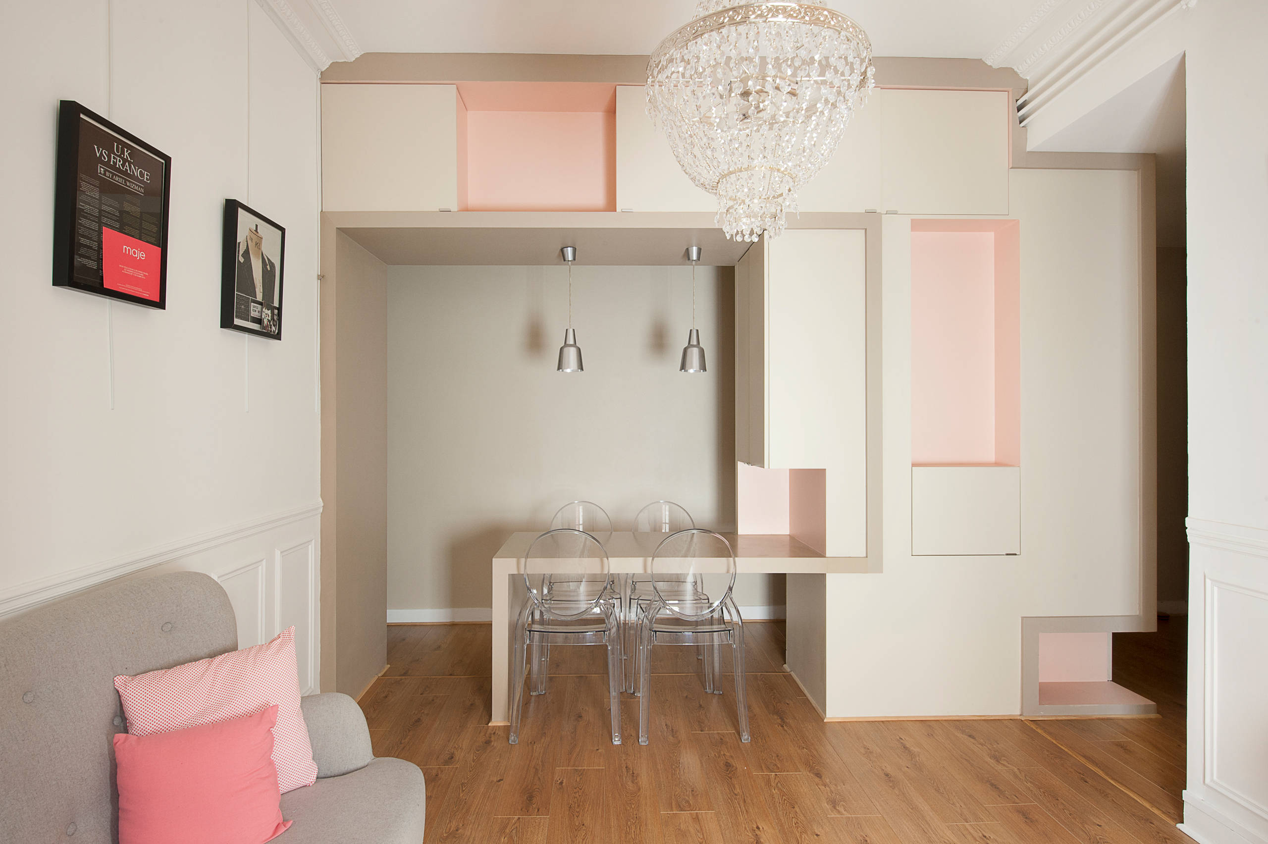 Fini les longs couloirs sombres, grâce à ce mur composé qui se prolonge en table à manger, les espaces sont séparés mais pas cloisonnés. La peinture rose posée en petites touches décompose le volume qui s’intègre délicatement dans cet appartement parisien.