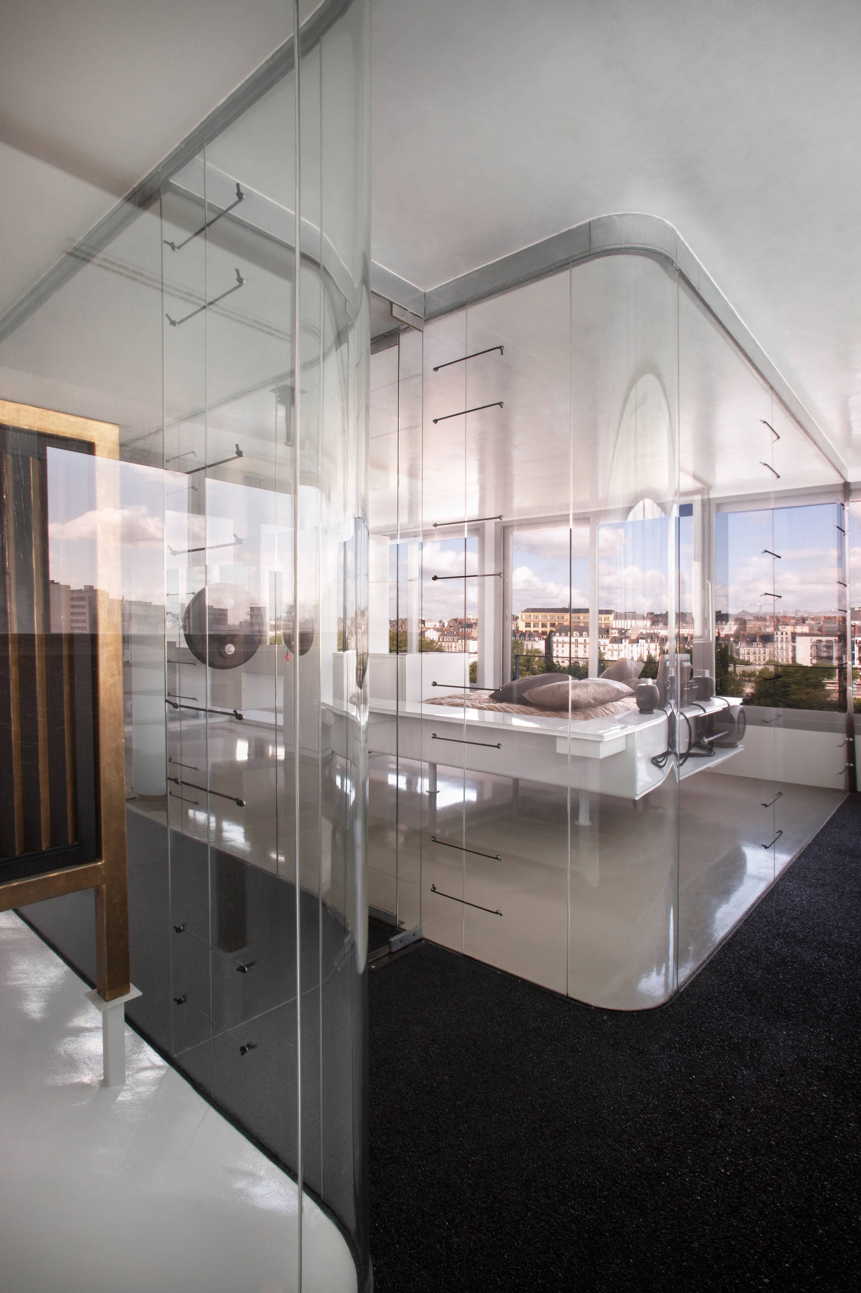 Dans ce projet niché au cinquième étage d’un immeuble nantais, les murs sont tombés pour laisser place à l’essentiel. Fantasme se conjugue avec oisiveté derrière ces murs de verre qui délimitent les pièces habituelles d’un appartement dans une transparence radicale. La vue à 360° dont bénéficie cette chambre au « lit-vestiaire » transforme sa petitesse en infini.