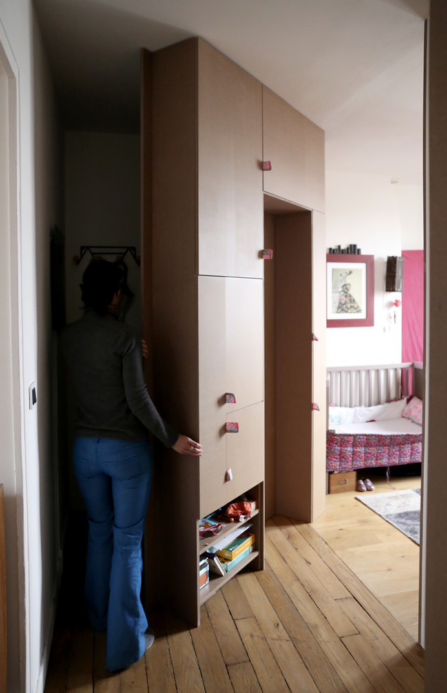 Et si au lieu d’une porte traditionnelle, c’est toute la cloison qui pivotait pour ouvrir l’espace ? Cette ingénieuse paroi permet à la chambre d’enfant de s’agrandir la journée, l’espace de jeux s’étend au couloir. Conçue en médium écologique, cette cloison mobile est aussi un meuble de rangement. La lumière naturelle traverse l’appartement durant la journée… et la nuit venue, les espaces se referment dans une intimité rassurante.
