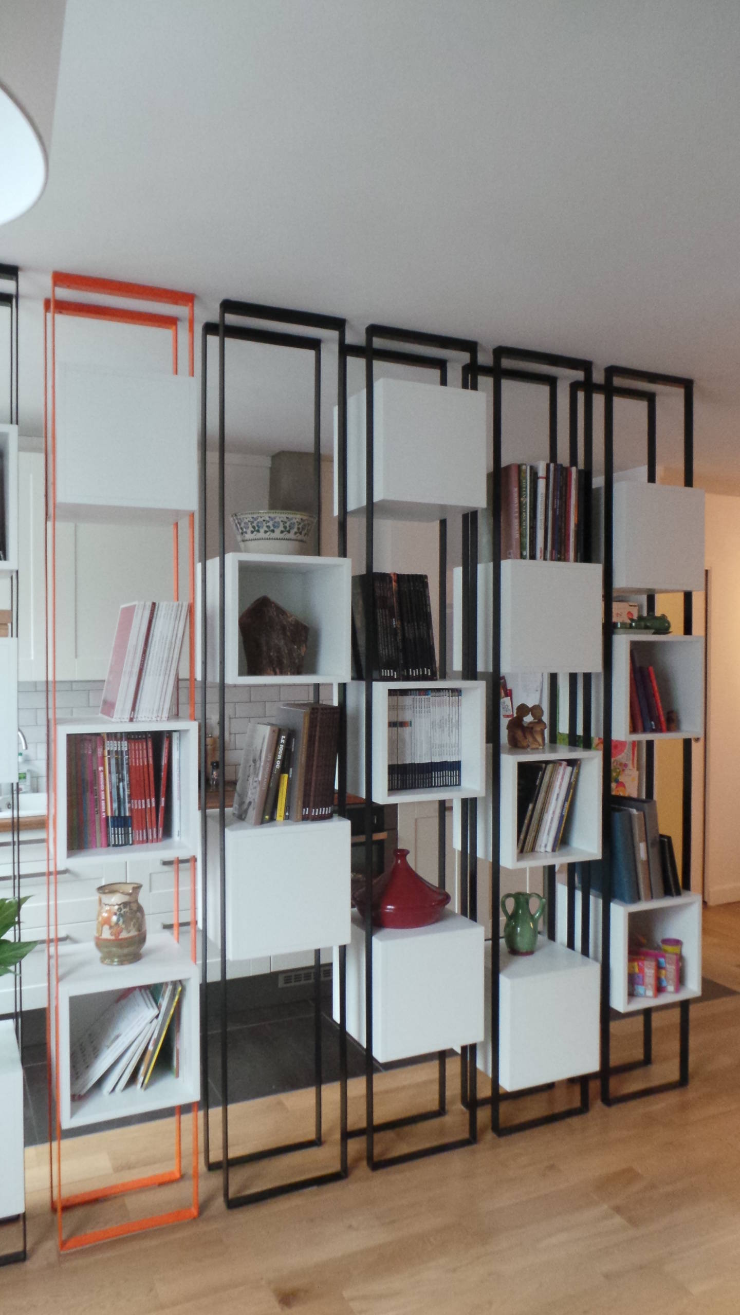 Une cuisine à l’américaine c’est bien… mais comment éviter qu’elle ne déborde un peu trop sur le séjour ? Une étagère savamment composée et bien disposée résout ce dilemme. Salon et cuisine communiquent sans empiéter l’un sur l’autre.