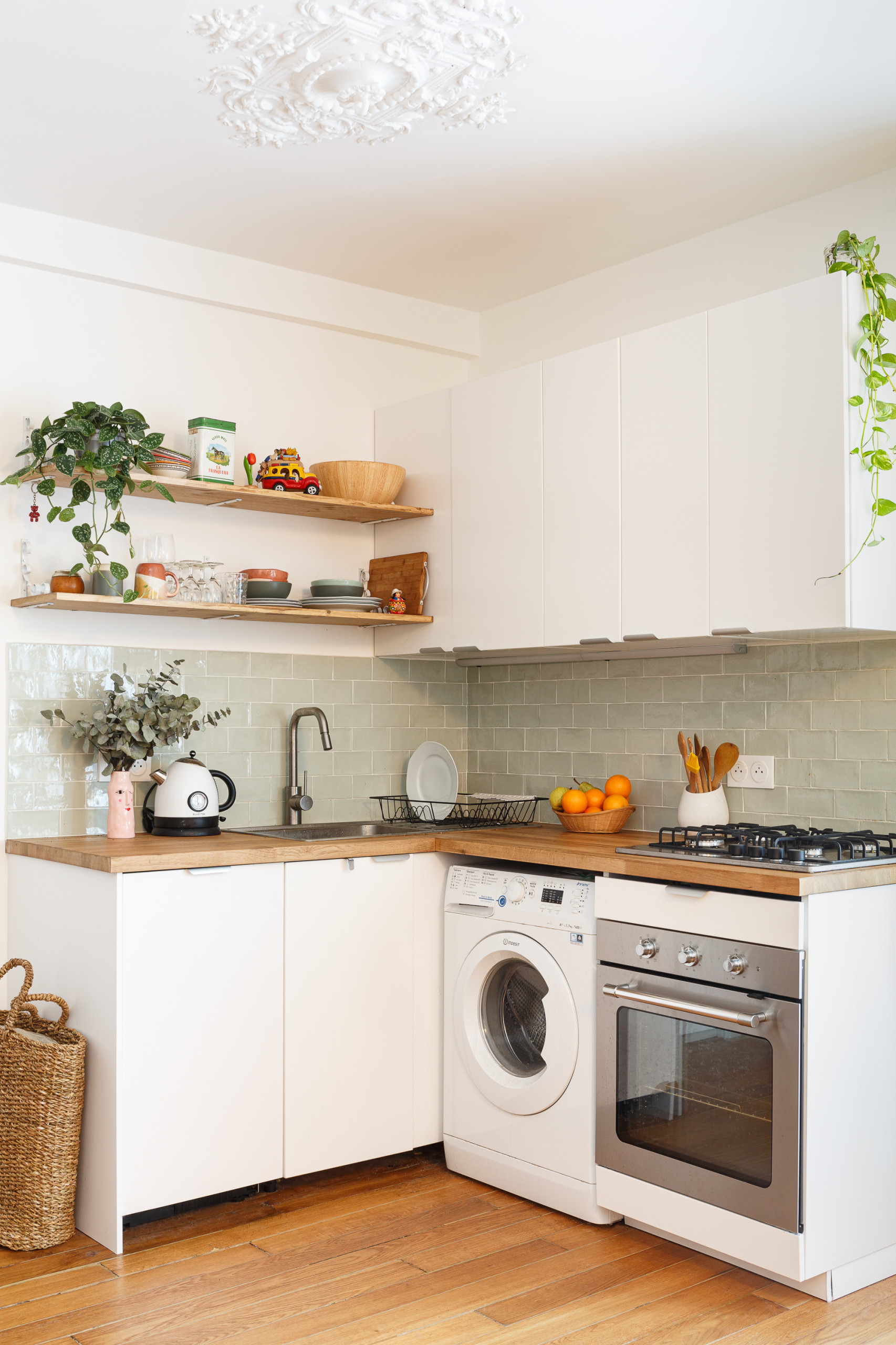 L’installation harmonieuse des éléments électroménagers est renforcée par les façades blanches et le plan de travail en bois, qui crée une continuité visuelle. Des étagères ouvertes maximisent le rangement sans alourdir l’espace, tandis que la crédence en carreaux vert pastel apporte une touche chaleureuse et lumineuse.