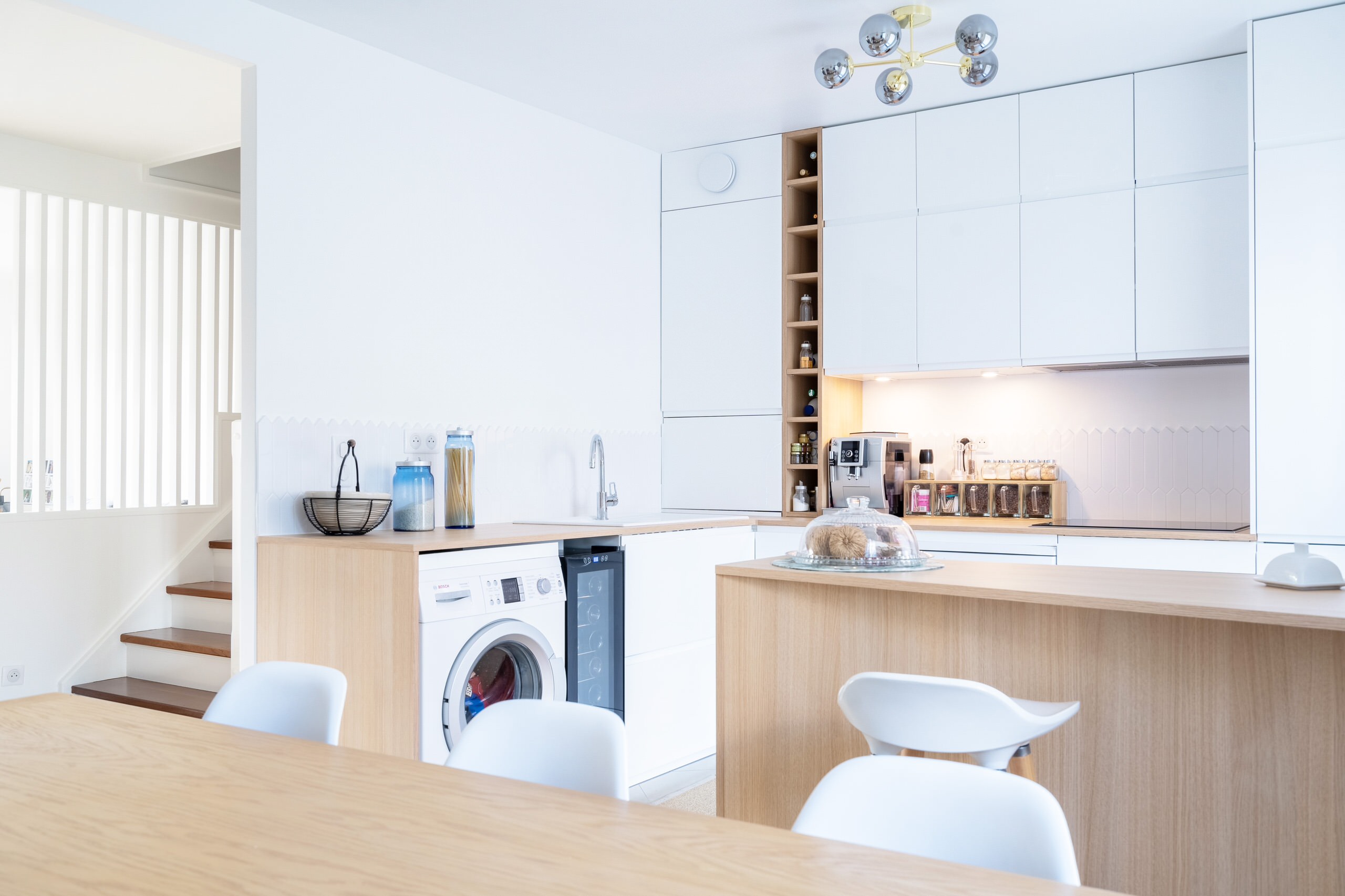 Le lave-linge trouve sa place dans l’alignement des meubles bas, libérant ainsi de la surface tout en conservant une circulation fluide. Le choix d’un plan en bois chaleureux et de façades aux teintes douces permet d’harmoniser l’ensemble. La cloison ajourée en bois structure l’espace sans l’alourdir, offrant une séparation subtile entre la cuisine et la salle à manger.