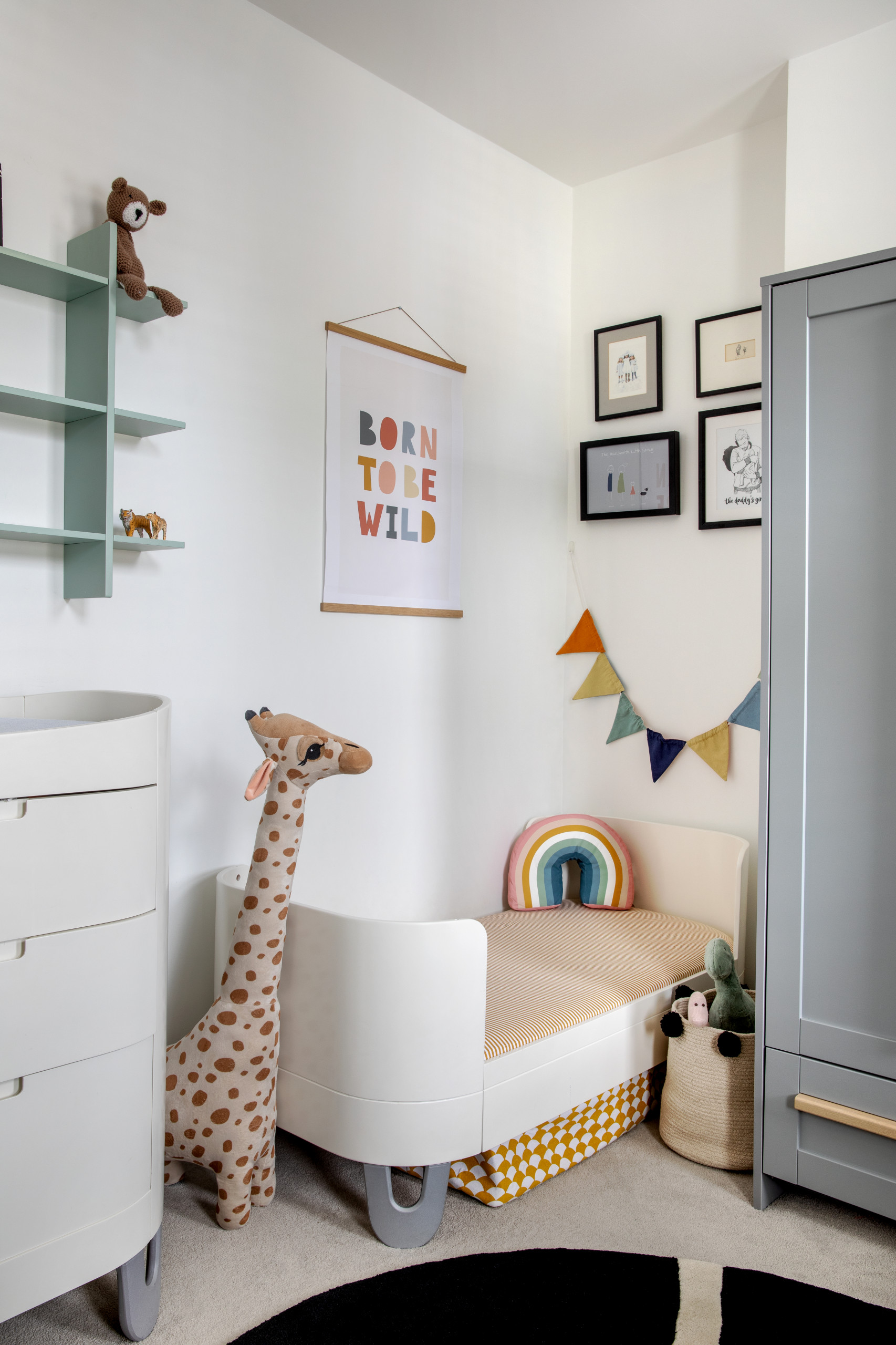 En dehors des phases de sieste, bébé s’éveille et commence à observer ce qui l’entoure. Son environnement contribue à cette phase d’éveil et c’est pourquoi il est important de placer des objets dans sa chambre qu’il pourra voir en position allongée. Les mobiles sont parfaits, car ils bougent, sont souvent colorés et parfois même musicaux. Il vaut mieux cependant le fixer de manière à ce que le bébé ne puisse pas l’attraper et le tirer. Les têtes d’animaux en peluche, très en vogue, sont aussi adéquates, car douces et rigolotes à observer. Misez aussi sur les affiches et n’hésitez pas à mettre de petites étagères en hauteur, pour disposer de jolis objets ou des photos de la famille.