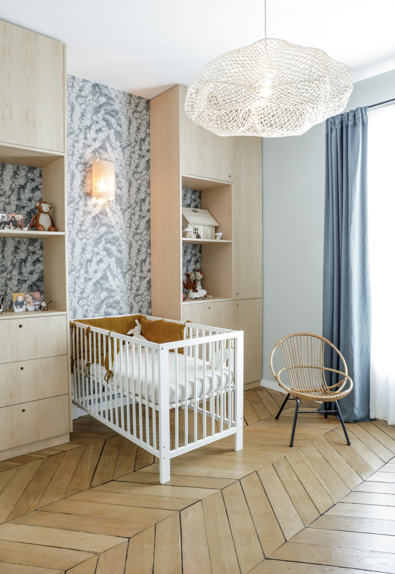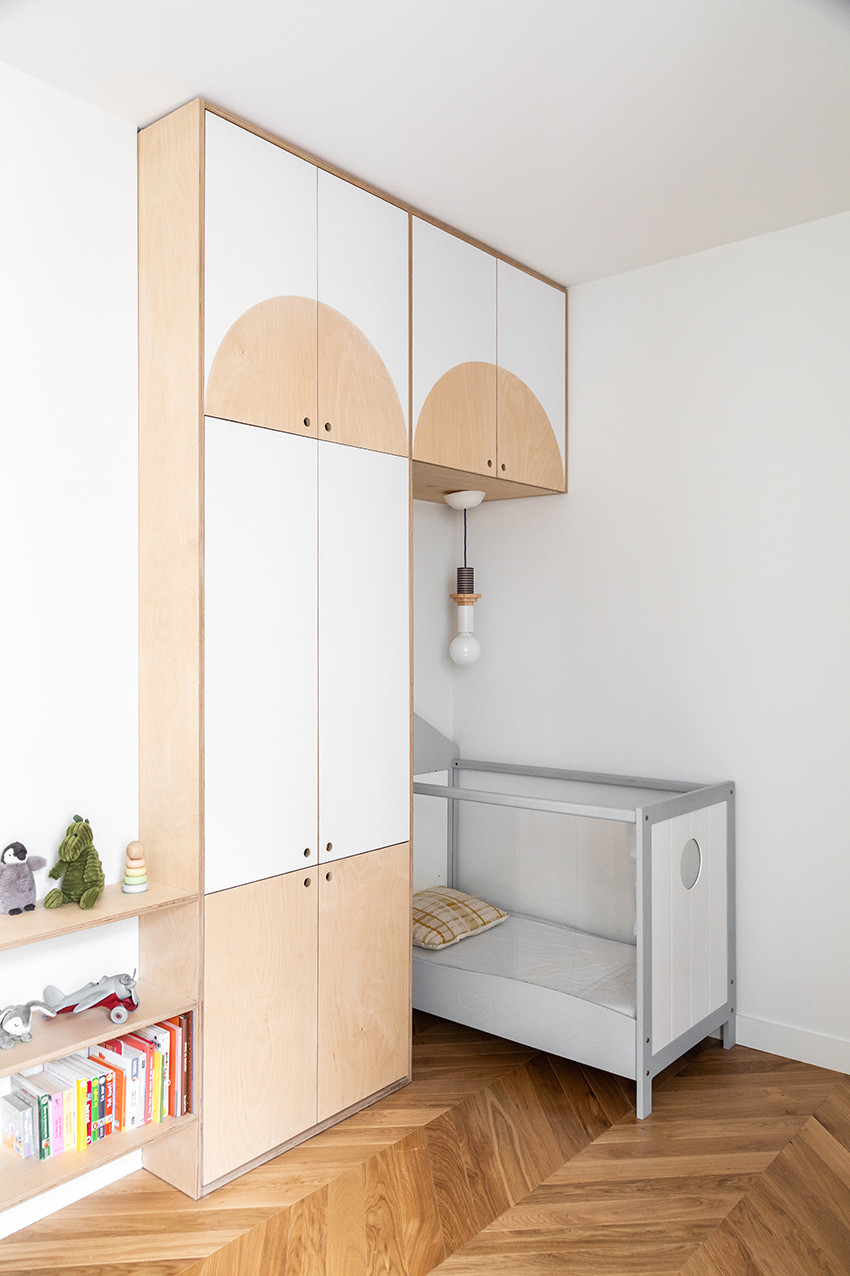Si ses toutes petites affaires ne prennent pas beaucoup de place au début de sa vie, vous allez découvrir que la chambre va rapidement être envahie de jeux, jouets, équipements de toute sorte qui peuvent énormément encombrer. Anticipez en prévoyant des rangements fermés, pour dégager la pièce. Attention cependant à ne pas mettre des meubles trop massifs ou imposants, comme l’armoire normande familiale, au risque d’effrayer bébé. L’agencement sur mesure est la solution idéale, car un artisan ou un architecte saura vous proposer des aménagements adaptés à la pièce et à vos besoins, tout en créant un ensemble ludique dans lequel bébé se sentira bien et pourra évoluer.