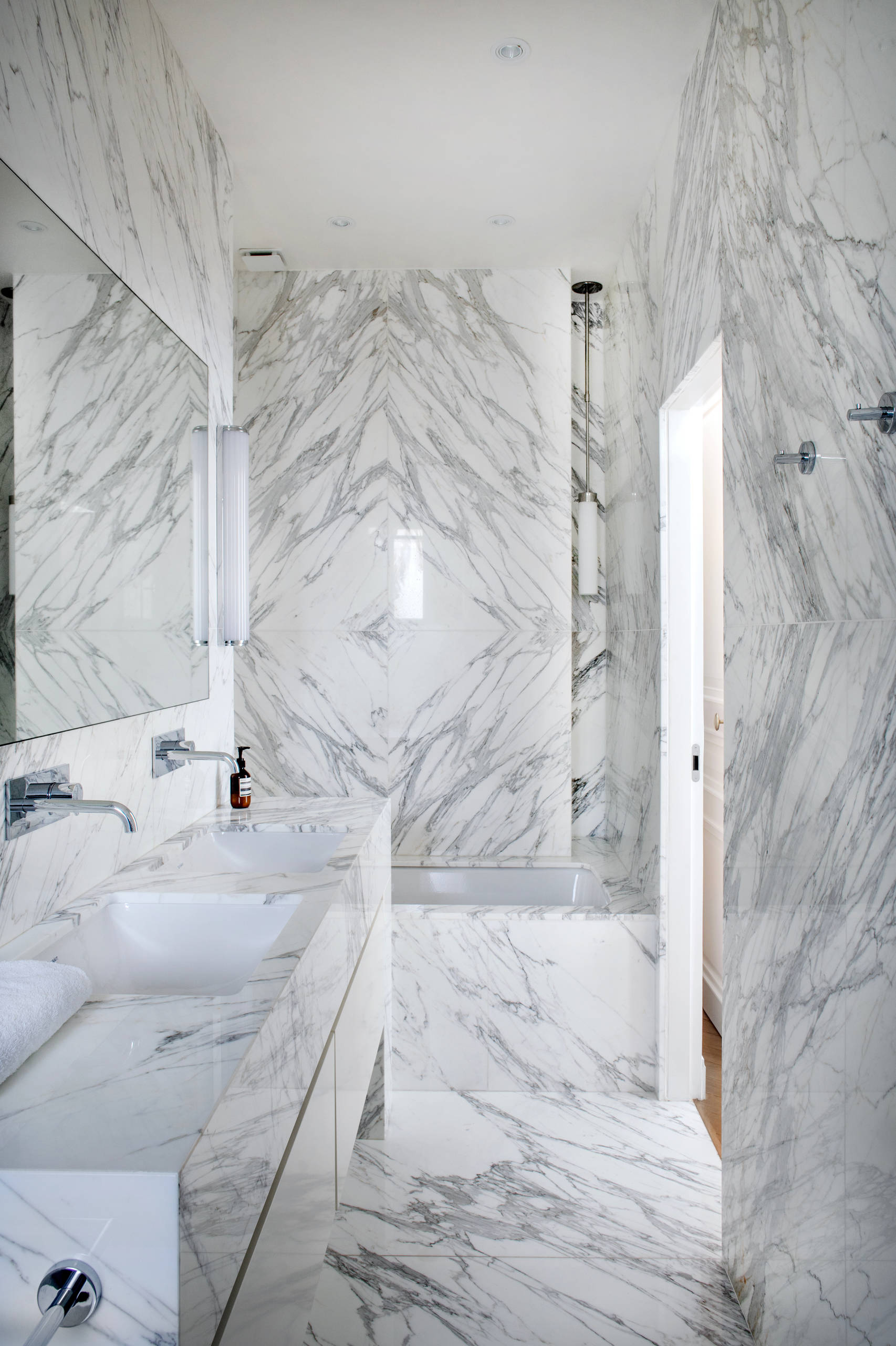 C’est le matériau luxueux par excellence, dont nous sommes nombreux à rêver dans la salle de bains. Une beauté fragile aussi car ce matériau poreux est sensible au calcaire, aux produits acides et craint particulièrement les taches de parfum. Le marbrier Alfredo Peixeiro estime néanmoins qu’il est totalement approprié à n’importe quel endroit de la salle de bains moyennement un traitement spécial : « Il faut faire revenir tous les trois ou quatre ans le marbrier qui « recristallise » la surface du marbre, c’est-à-dire la nettoie, lui remet un apprêt hydrofuge brillant ou le ponce en surface s’il a été abîmé. » Dans une salle de bains, le marbre hydrofugé a généralement une finition polie et brillante qui n’est pas particulièrement glissante. Pour tous ceux qui redoutent néanmoins les chutes, il sera possible d’« adoucir » le marbre, c’est-à-dire de matifier en surface.