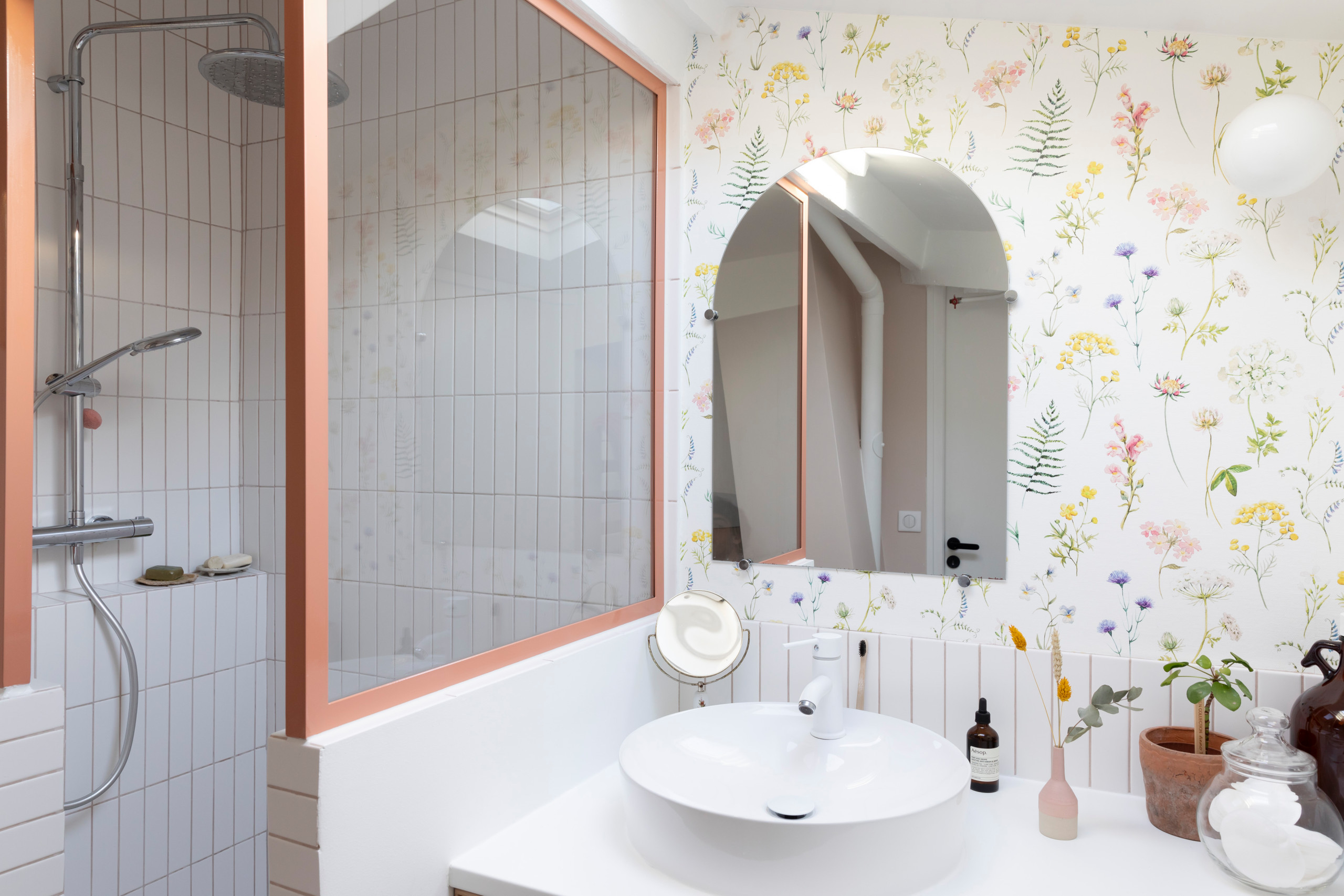 Et vous, oseriez-vous le papier peint sur les murs de la salle de bains, l'ardoise dans la douche et le parquet au sol ?