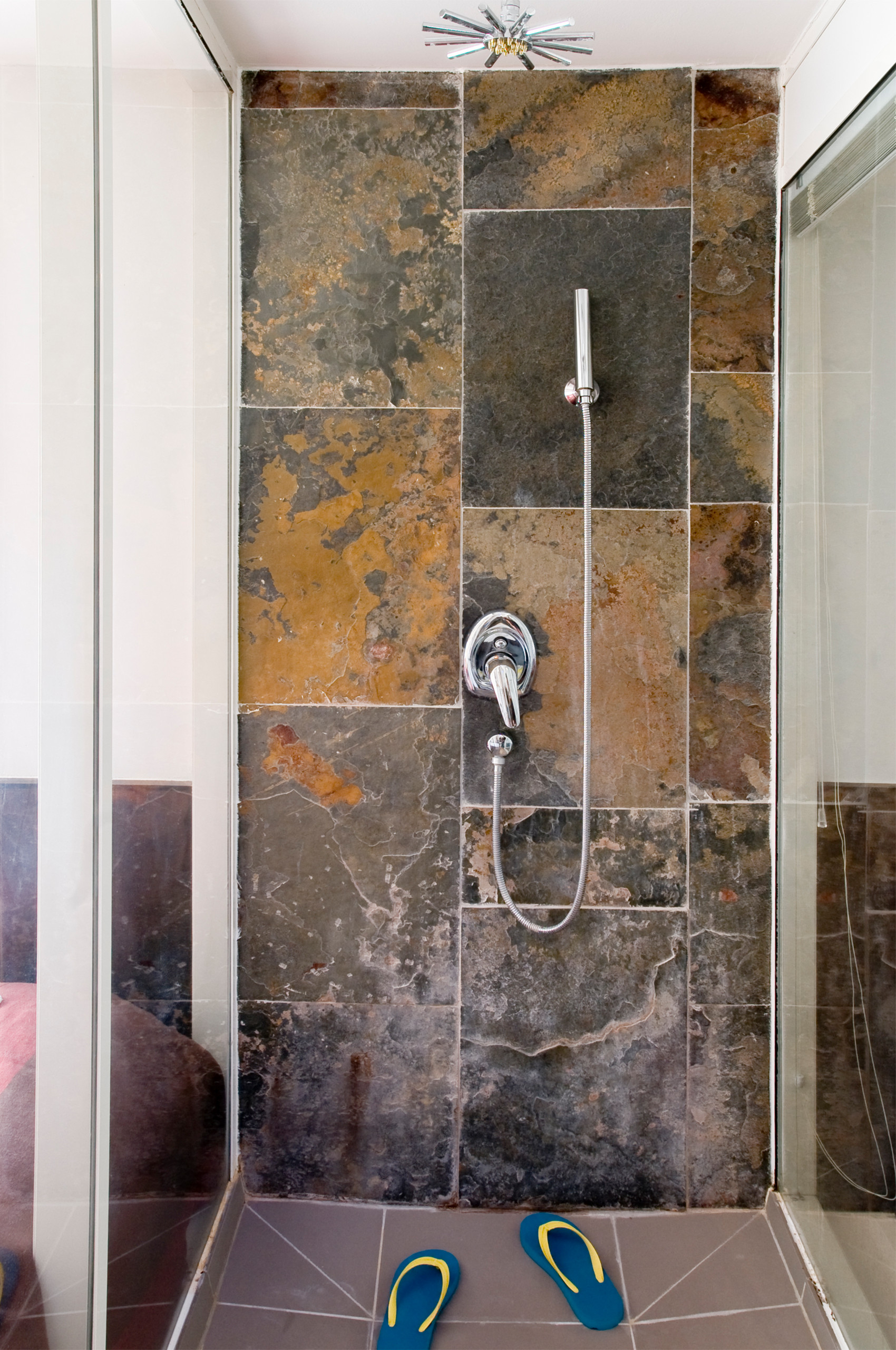 La maître d’œuvre Carina Nahmani confirme : « Le problème de l’ardoise, c’est le contact avec l’eau et le calcaire. Sa couleur noire marque plus qu’une autre pierre. Quand le carreau de ciment se patine, l’ardoise, elle, paraît sale avec le temps. »