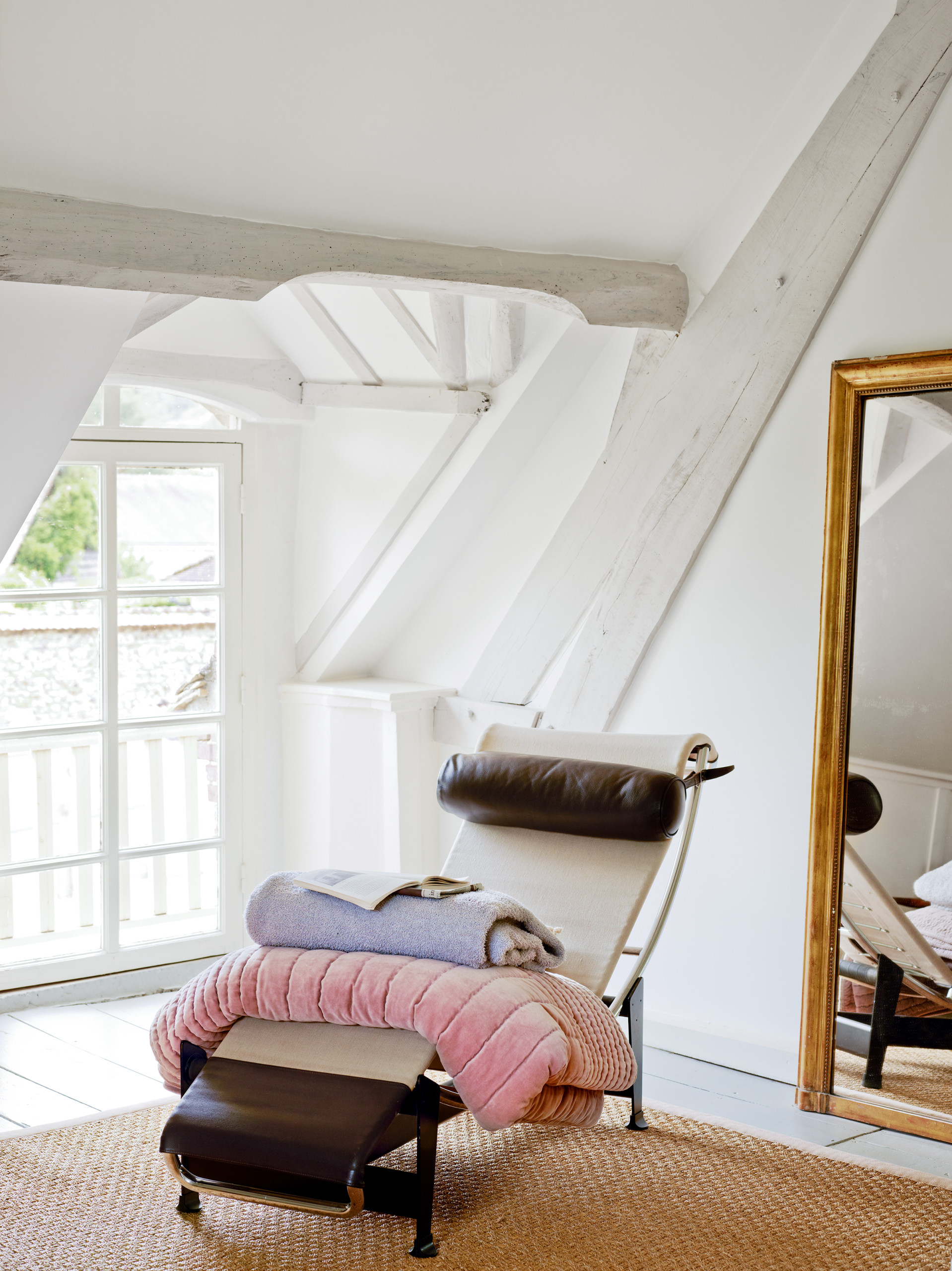 Si vous habitez sous les combles, peindre le plafond en blanc permet de diffuser la lumière qui émane des fenêtres dans l’espace. N’hésitez pas à peindre les poutres apparentes - si vous en avez - de cette même teinte pour que l’ensemble soit de la même couleur. Placez un miroir comme sur la photo ci-contre peut également contribuer à la diffusion de la lumière naturelle.