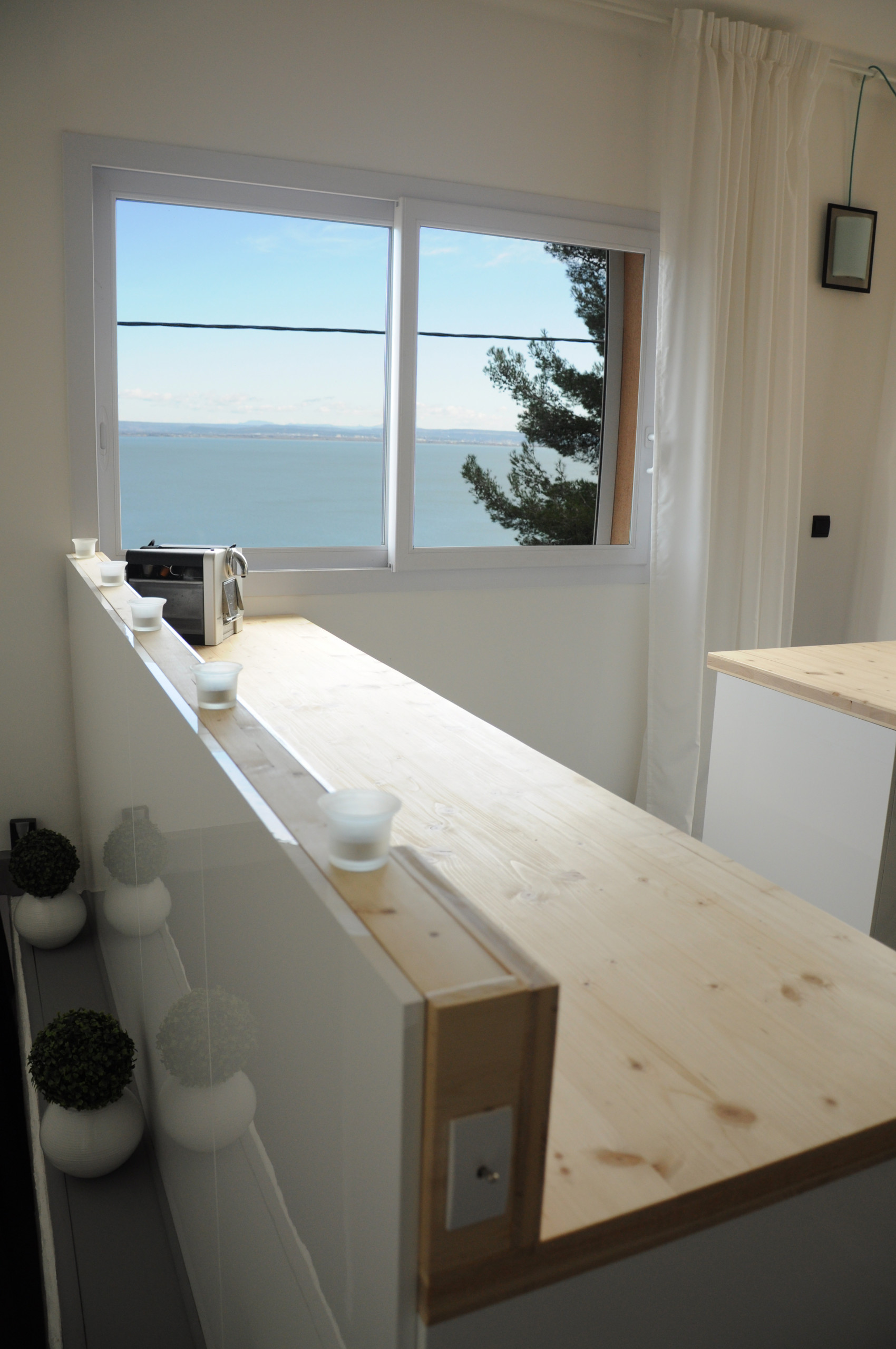 Dans une cuisine ouverte, installer un comptoir à côté ou sous une fenêtre est la meilleure astuce pour avoir une surface plane bien éclairée naturellement. Vous pouvez ensuite l’utiliser comme plan de travail ou comme coin pour déjeuner ou dîner, sans avoir à poser une lampe dessus. De plus, l’agencement de la pièce sur la photo confère un graphisme et un dynamisme certains à la cuisine, grâce aux lignes de la fenêtre et du comptoir.