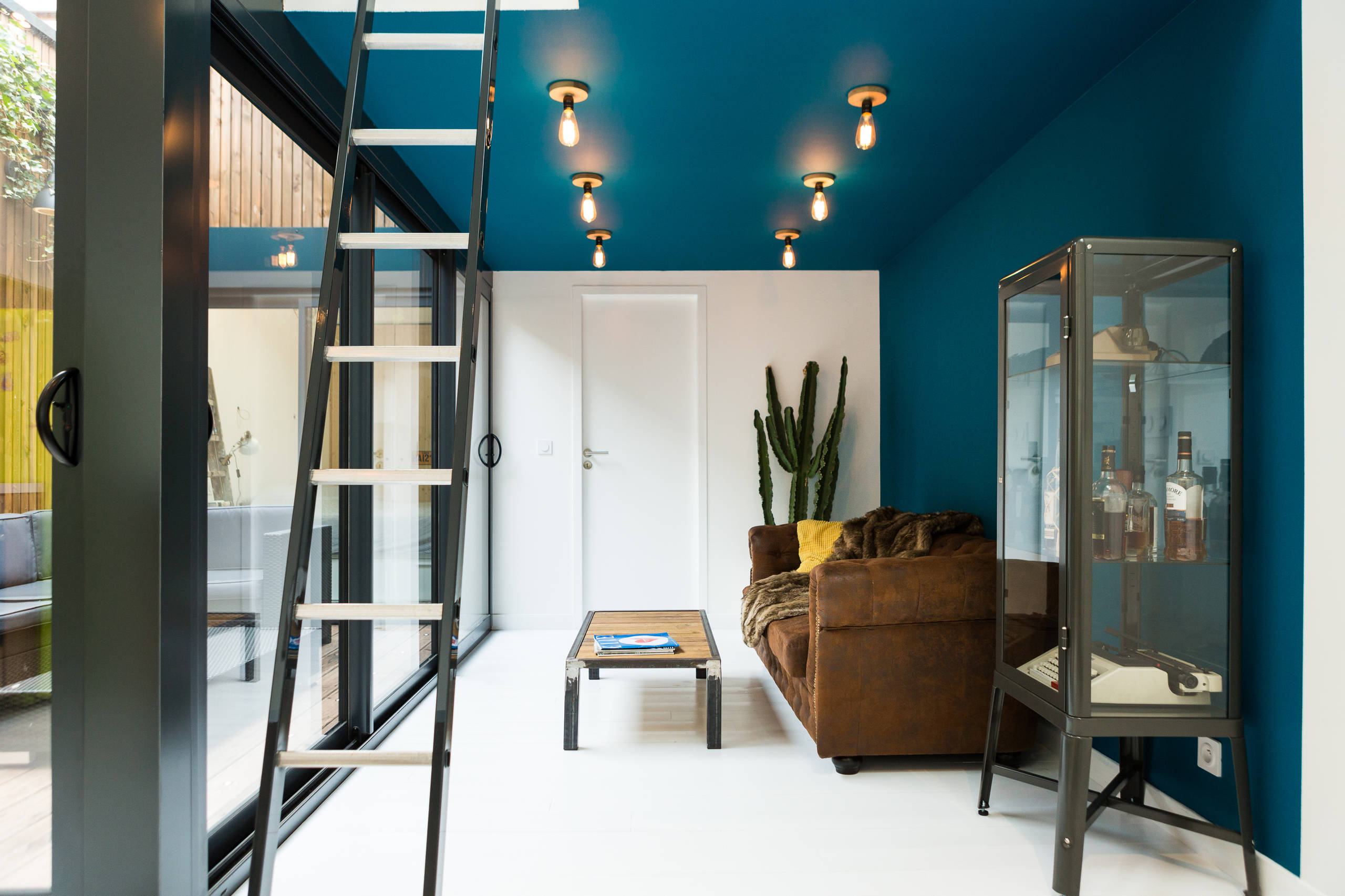 Appliquer une couleur en continuité sur un mur et son plafond structure les volumes de la pièce. Ici, le contraste entre le sol et le mur du fond immaculés et le bleu intense et lumineux propose un effet cocon à cet espace salon. Ce choix de plafond bleu est amplifié par la baie vitrée dont la lumière naturelle sublime l’effet.