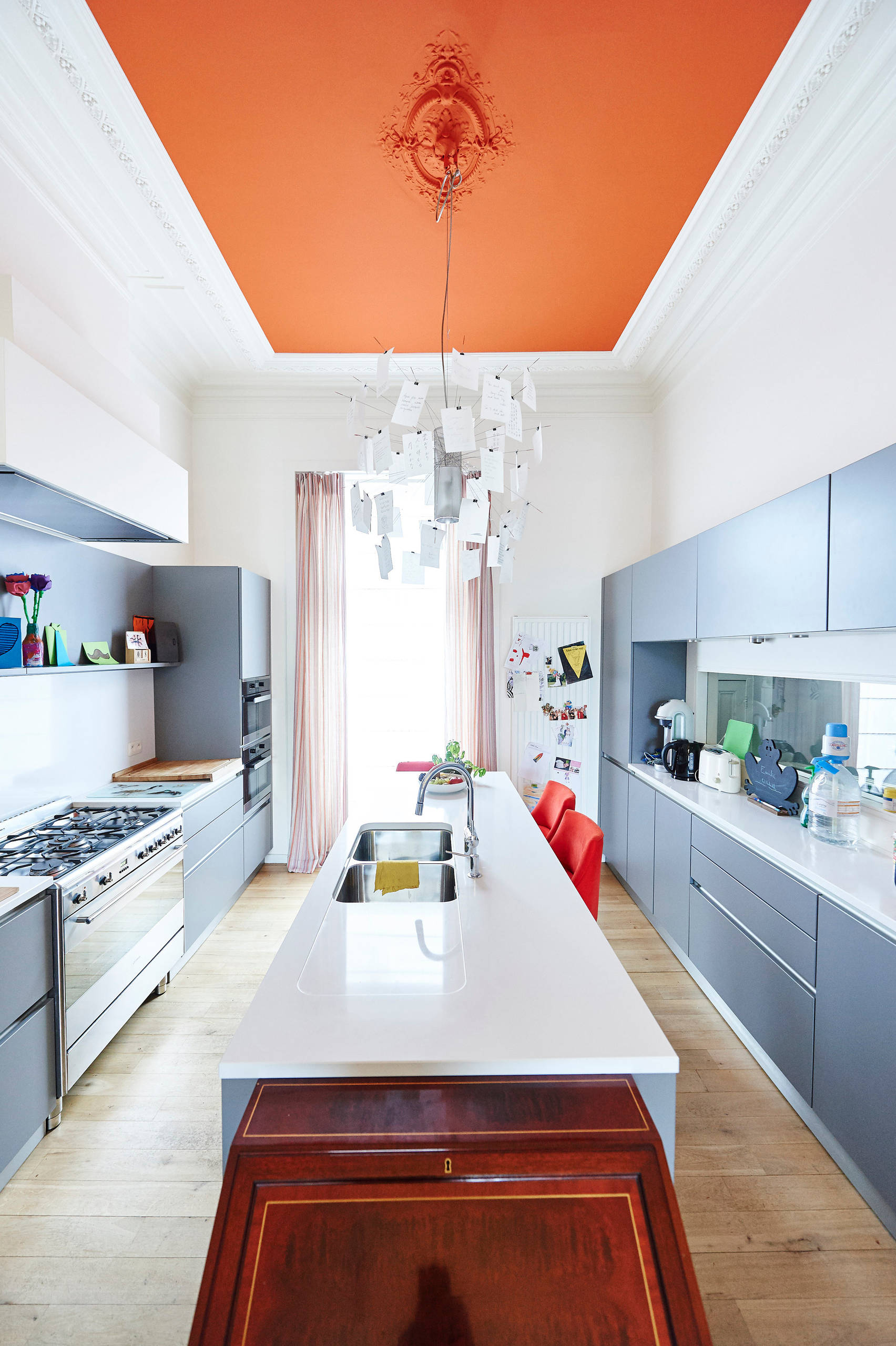 Un autre exemple de théâtralisation, encore plus frappant que le précédent, avec ce plafond orange vif de finition mat qui accentue les lignes de fuite de la pièce. Un choix radical et contemporain !