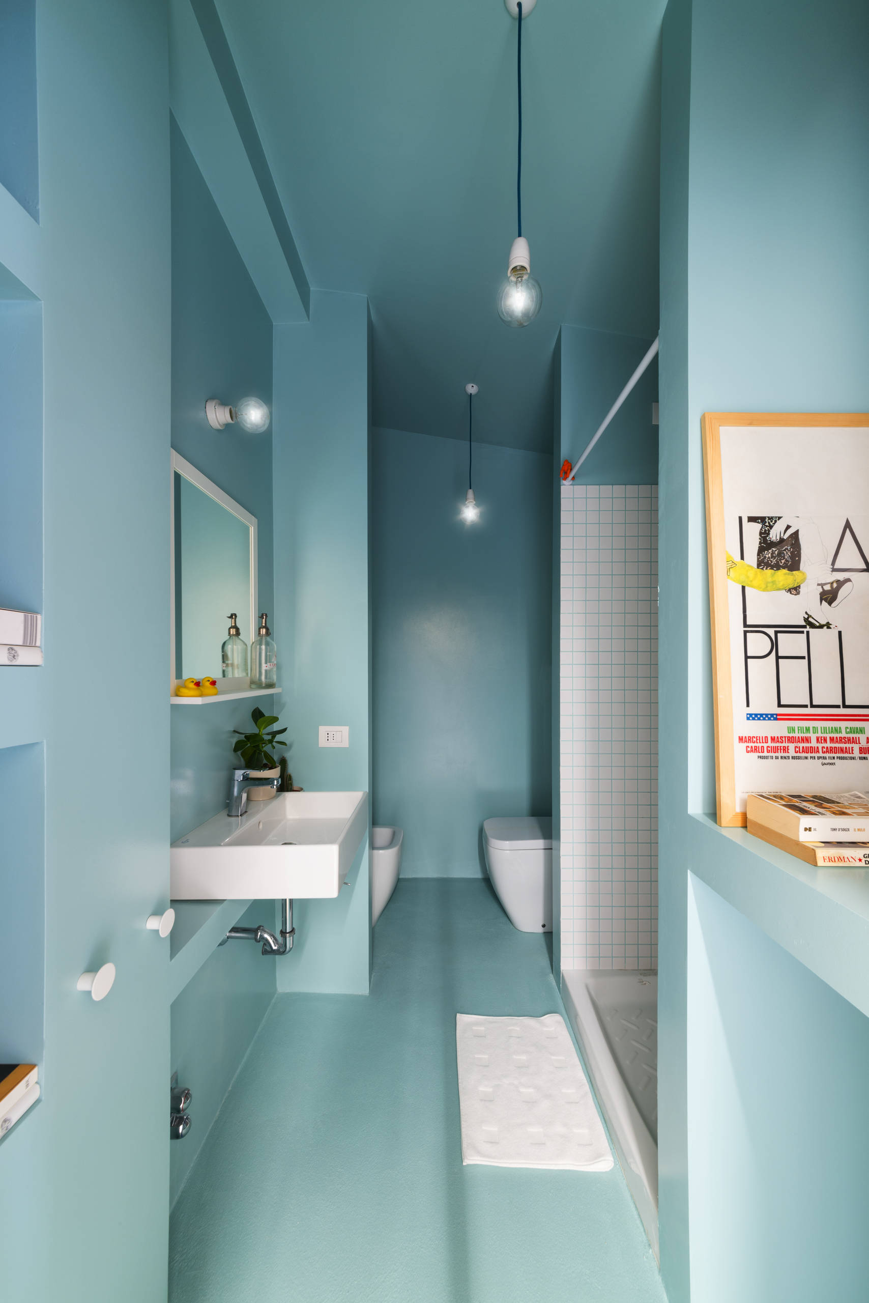 Peindre le sol, les murs et le plafond d’une couleur identique bouleverse la perception des volumes et renforce la sensation d’espace. Ici, la couleur vert d’eau, très douce, apporte de la fraîcheur et de la luminosité.