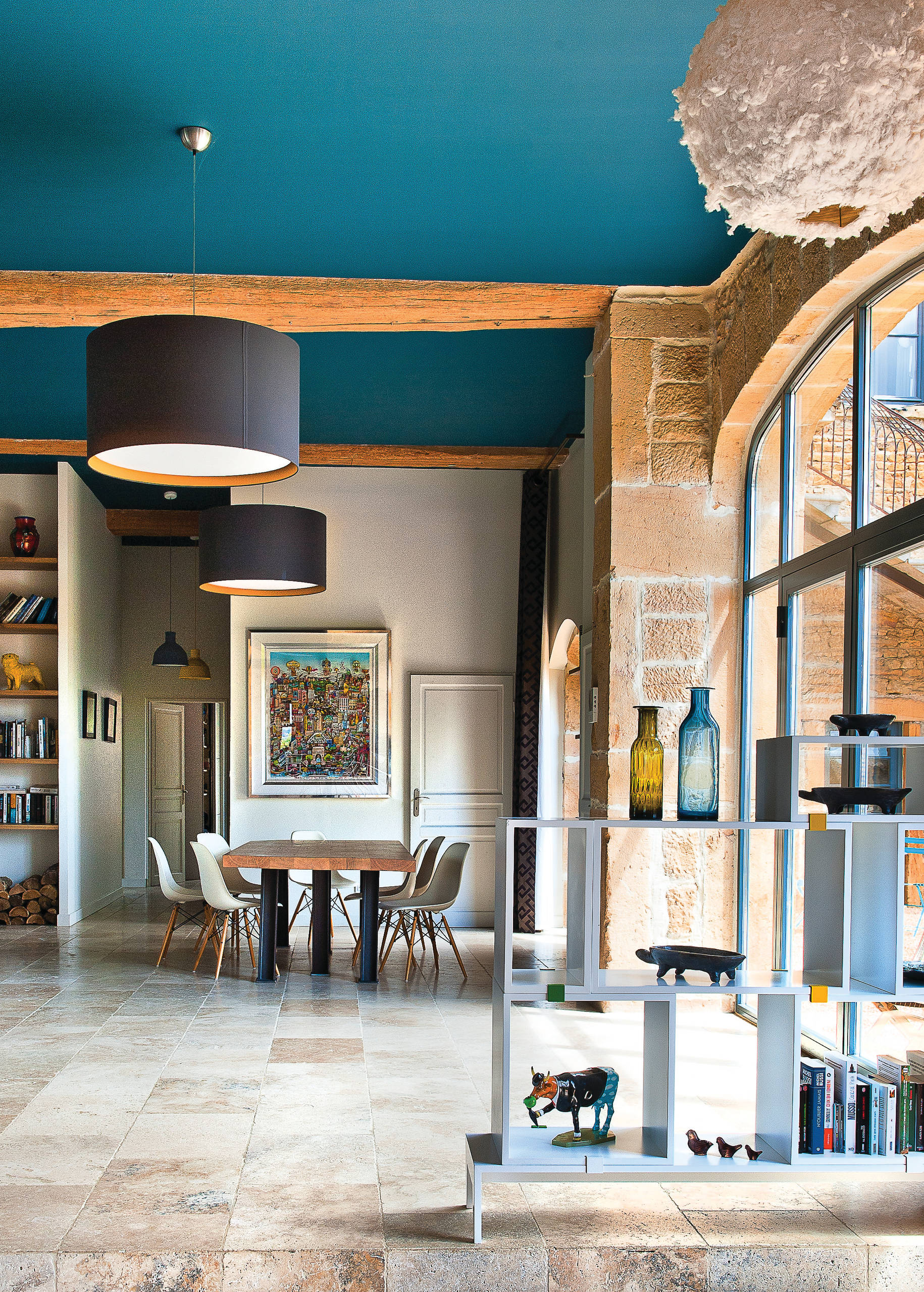 Comment donner de l’allure et de la singularité à une pièce ? Une des options consiste à peindre le plafond dans une couleur affirmée. Ici, la teinte choisie s’harmonise avec le bois et la pierre au sol et au mur.