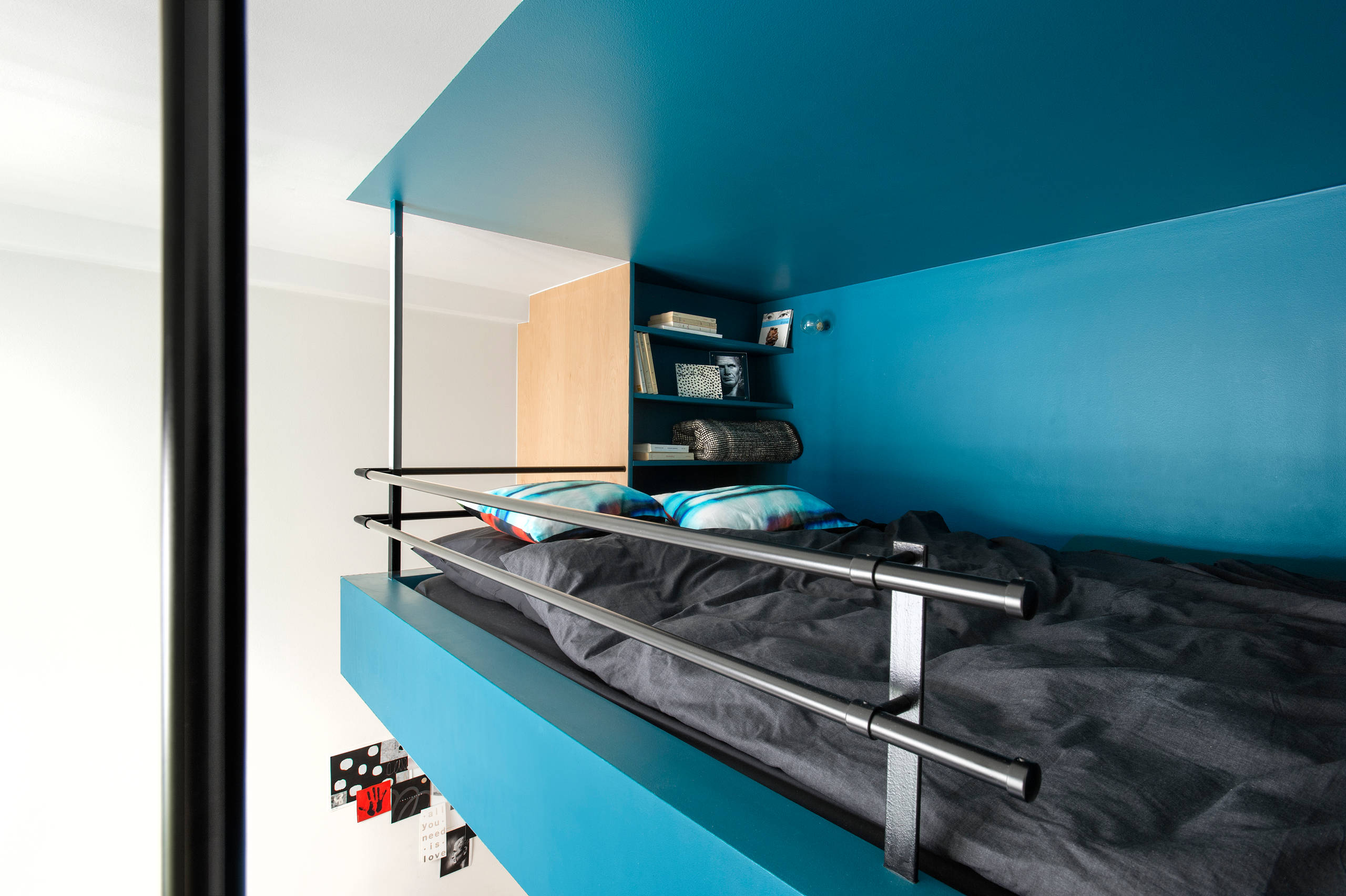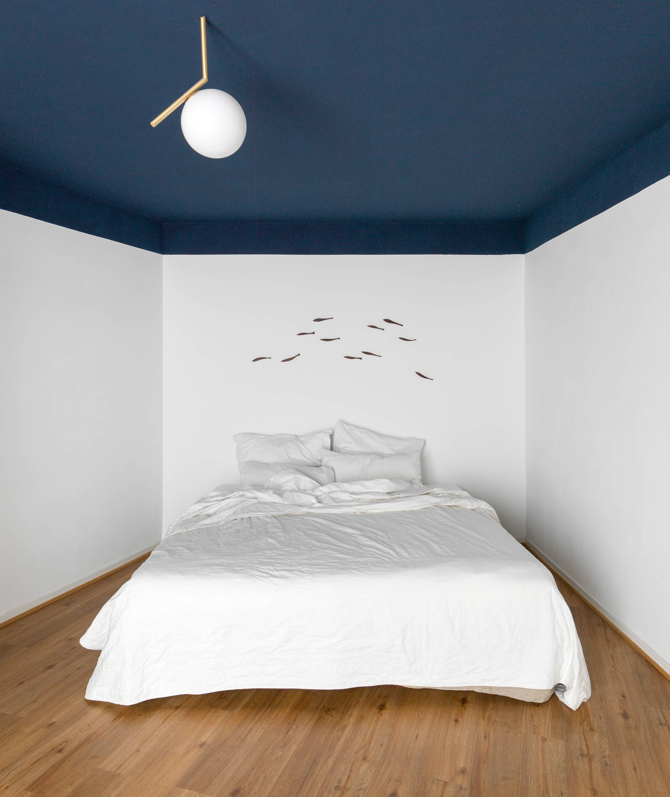 Lorsque l’on dispose d’une belle hauteur sous plafond, il est conseillé de diriger l’attention vers le « cinquième » mur. Ici, la même couleur reprise sur le mur, le plafond et la structure du lit crée un effet « boîte ». Ce principe fonctionne si la zone peinte au plafond est de la même dimension que le couchage. Le choix du bleu renforce l’impression d’une « chambre » aérienne tout en apportant beaucoup d’intimité.