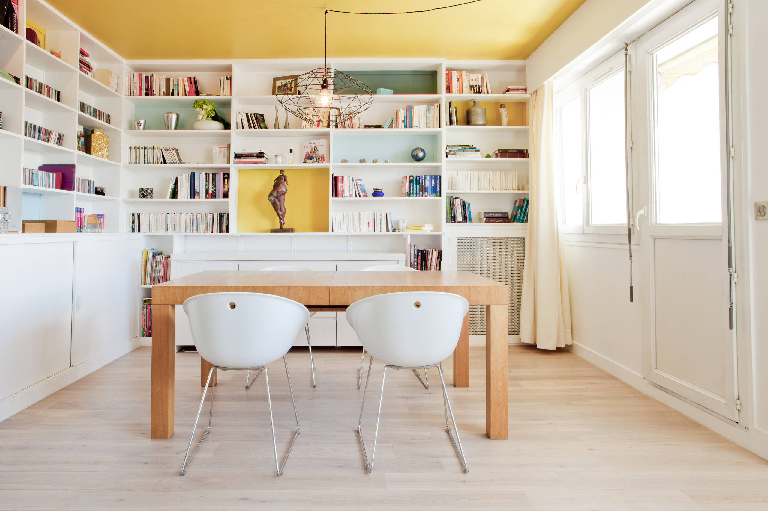 Dans cet exemple d’inspiration scandinave, le jaune éclatant, également repris dans certaines niches de la bibliothèque, propose un véritable rayon de soleil à cet espace multifonction, qui sert à la fois de bureau et de salle à manger. Cette couleur de plafond accentue aussi visuellement le volume global de l’espace.