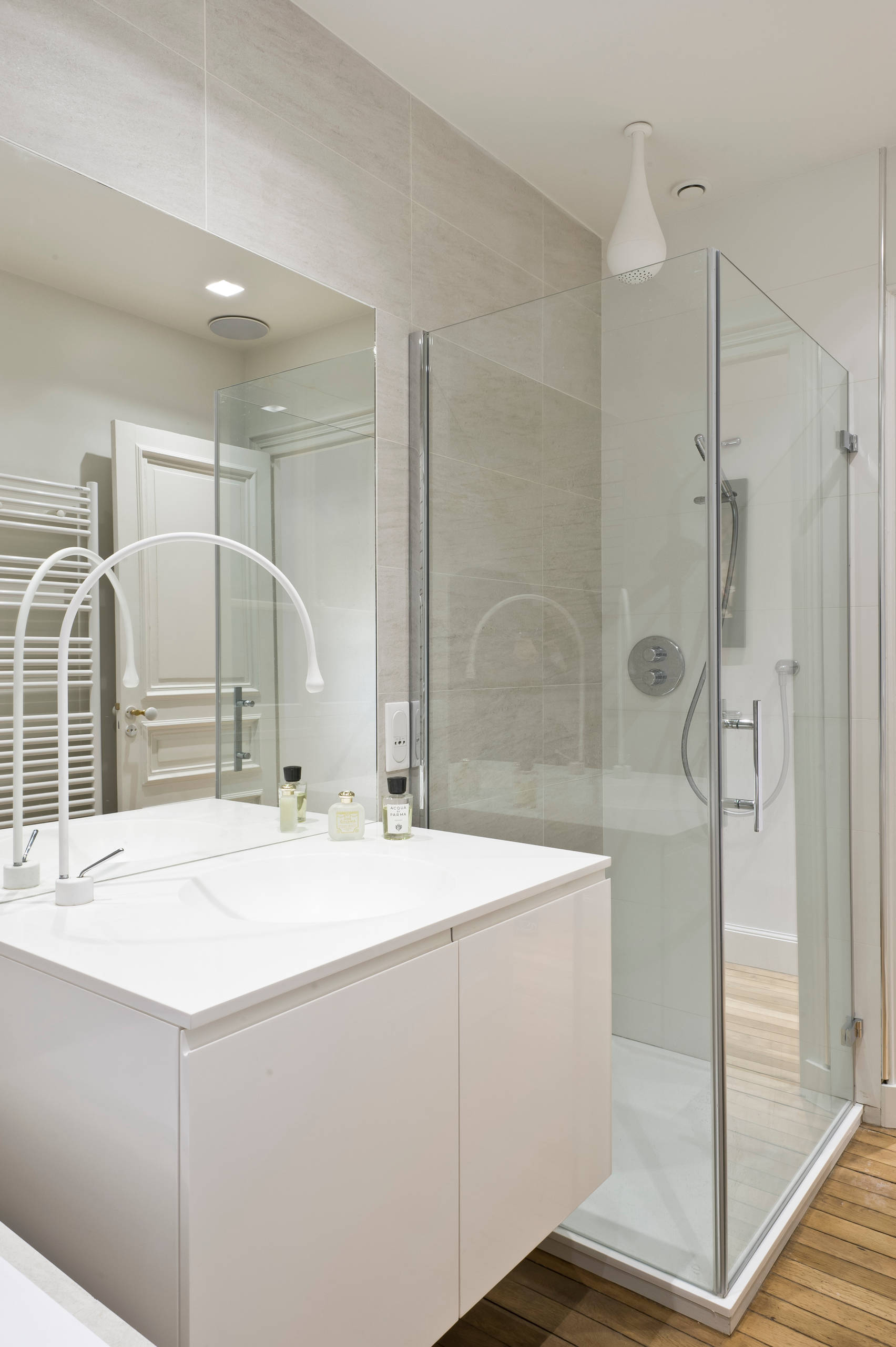 On peut aussi jouer sur le matériau de la robinetterie, qui tranchera avec le reste de la pièce. Ici, les éléments de commande et le radiateur en laiton doré se démarquent et apportent une touche chic et originale dans une salle de bains étroite.