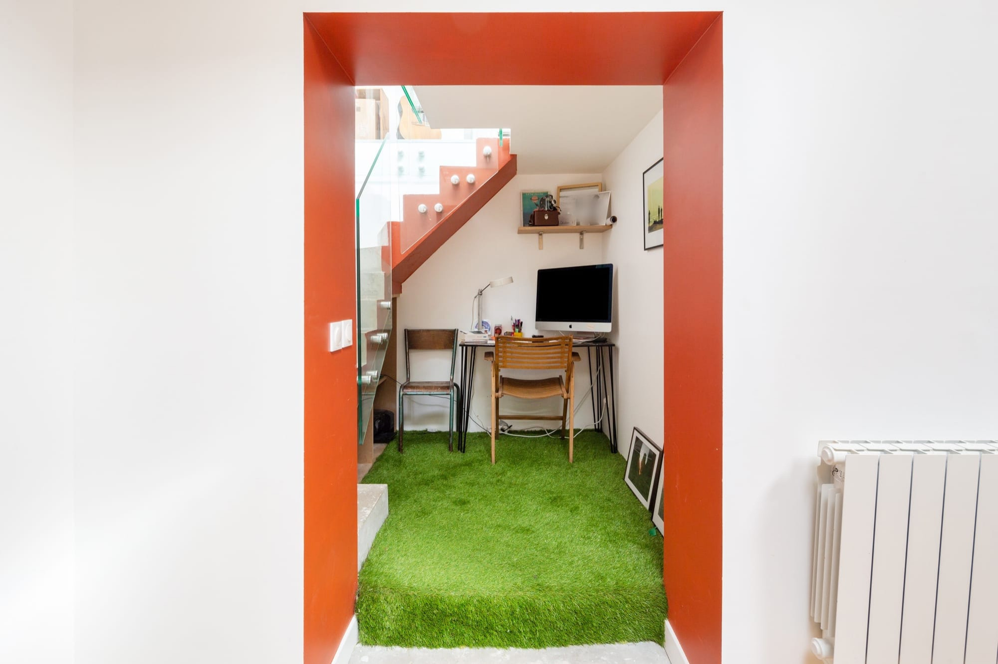 Les murs blancs et l’encadrement rouge ajoutent de la luminosité et de la chaleur à l’espace, créant un contraste vibrant avec le vert du sol. Sous l’escalier, un bureau minimaliste et des étagères murales permettent un aménagement fonctionnel sans encombrement. Ce petit coin de verdure est parfait pour s’évader tout en restant productif.
