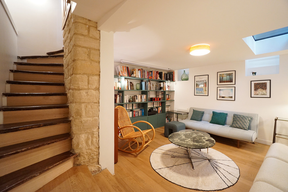 Les murs en pierre apparente et l’escalier en bois donnent du cachet à l’espace, tandis que les étagères intégrées et le mobilier contemporain apportent une touche de modernité. Le contraste entre les textures, avec la pierre et le bois, associé à des éléments de décoration moderne, crée une atmosphère conviviale, idéale pour se détendre.