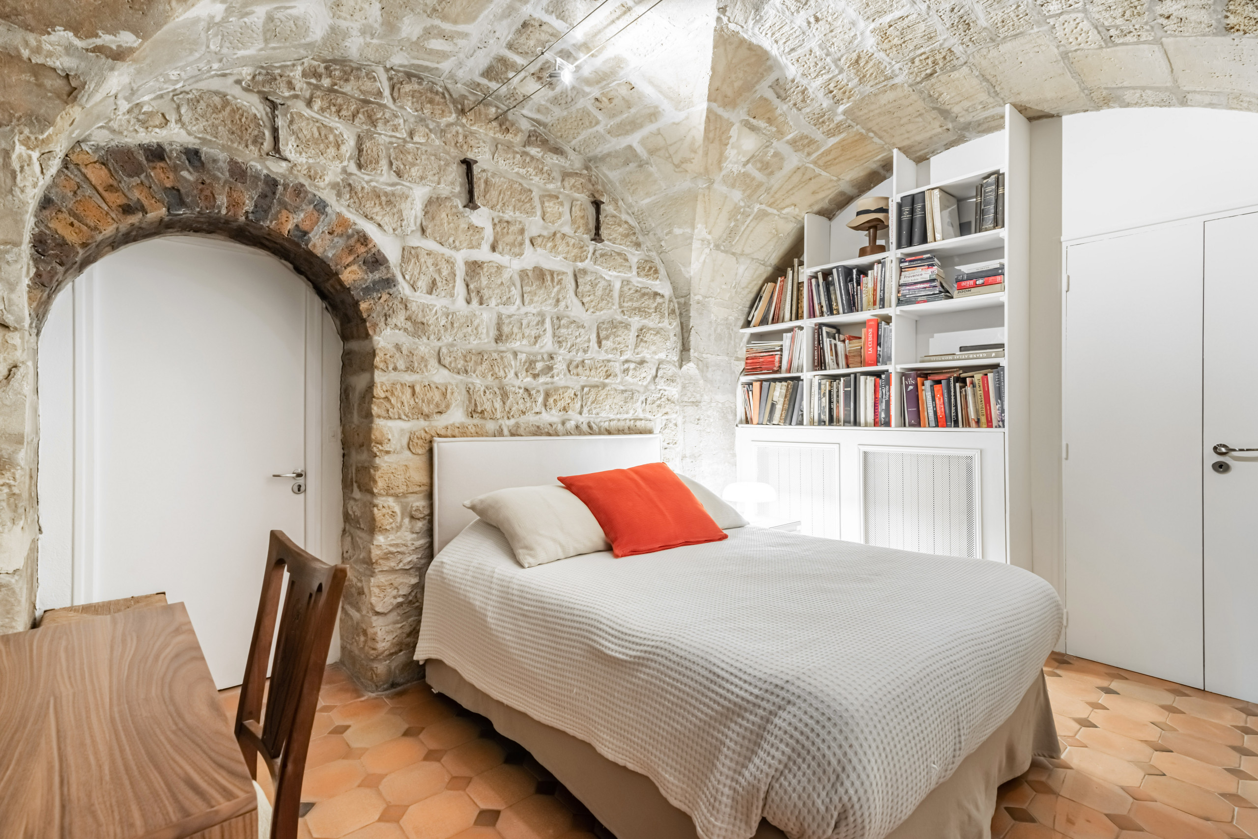 Les voûtes en pierre et le mur de briques apportent une touche rustique et authentique, tandis que le mobilier épuré et moderne crée un agréable contraste. Cet espace comprend également un bureau intégré, idéal pour travailler ou lire dans un environnement calme.