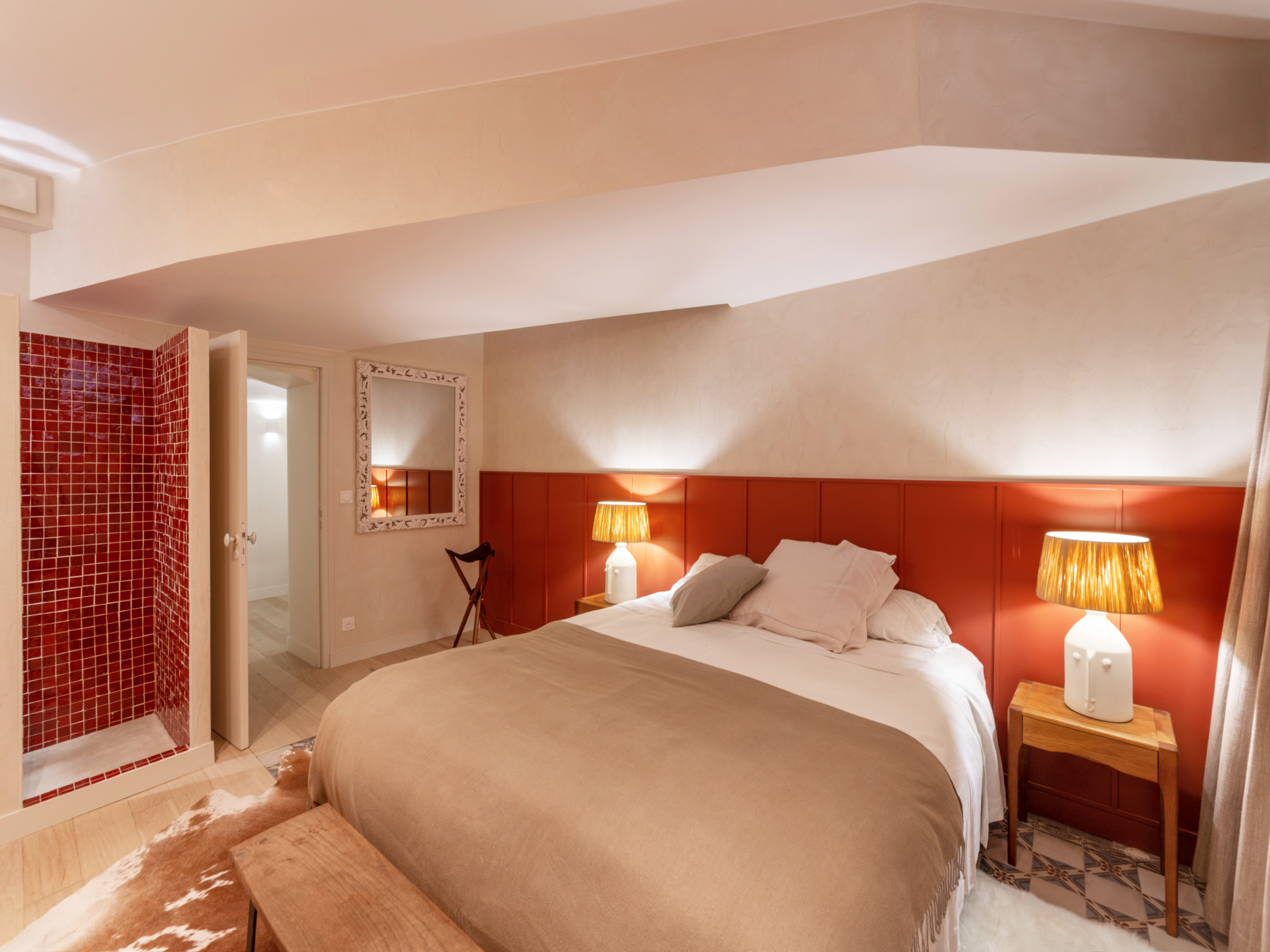 Le choix des couleurs chaudes, comme le rouge profond pour les carreaux de la douche et la tête de lit, apporte un sentiment de confort et de sérénité. Les luminaires et les éléments décoratifs en matières naturelles, comme les lampes en rotin et le tapis en fausse peau de vache, ajoutent à l’atmosphère cocooning.