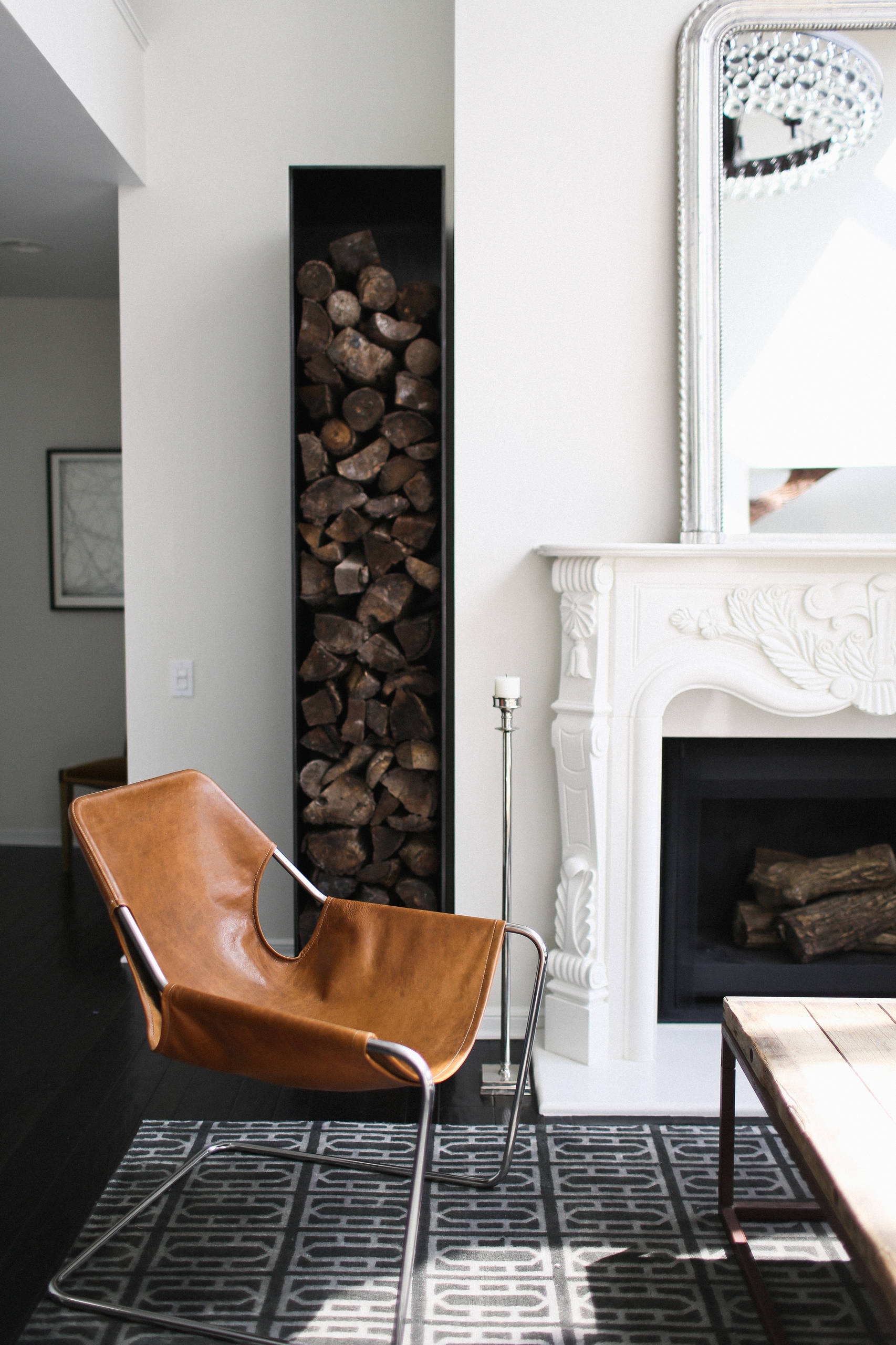 L’astuce : Prévoyez votre réserve de bois à portée de main dans un joli panier ou directement intégrée à la cheminée.