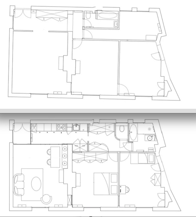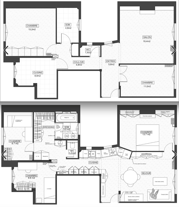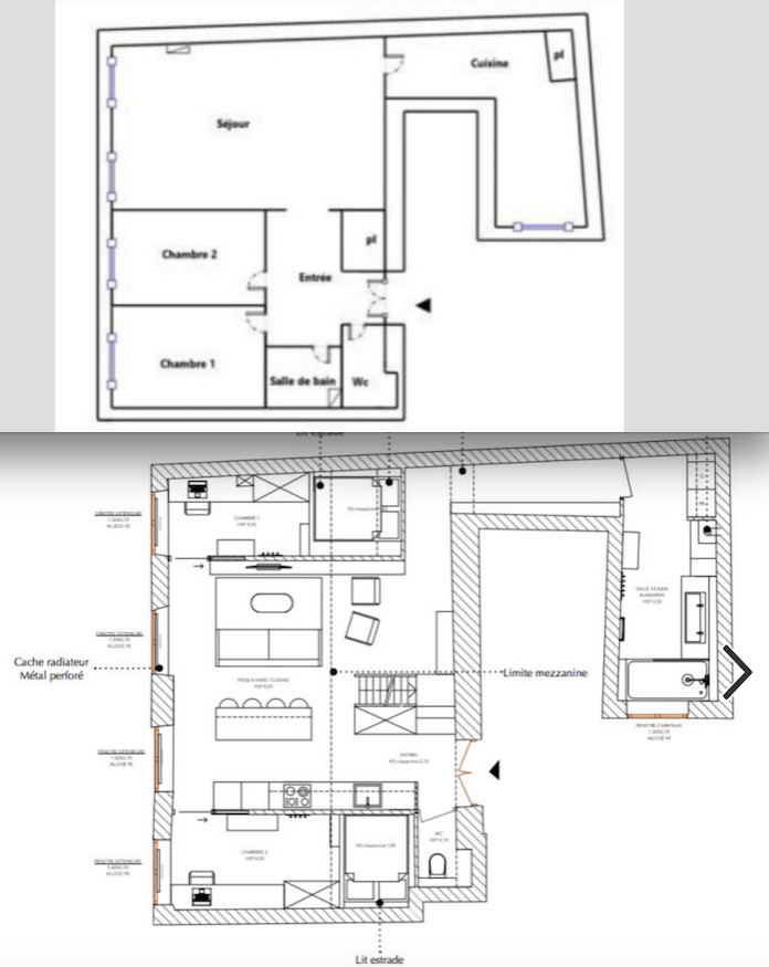 Plan avant travaux (en haut) et plan après travaux (en bas)