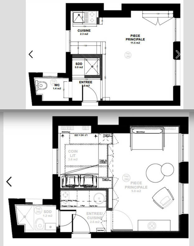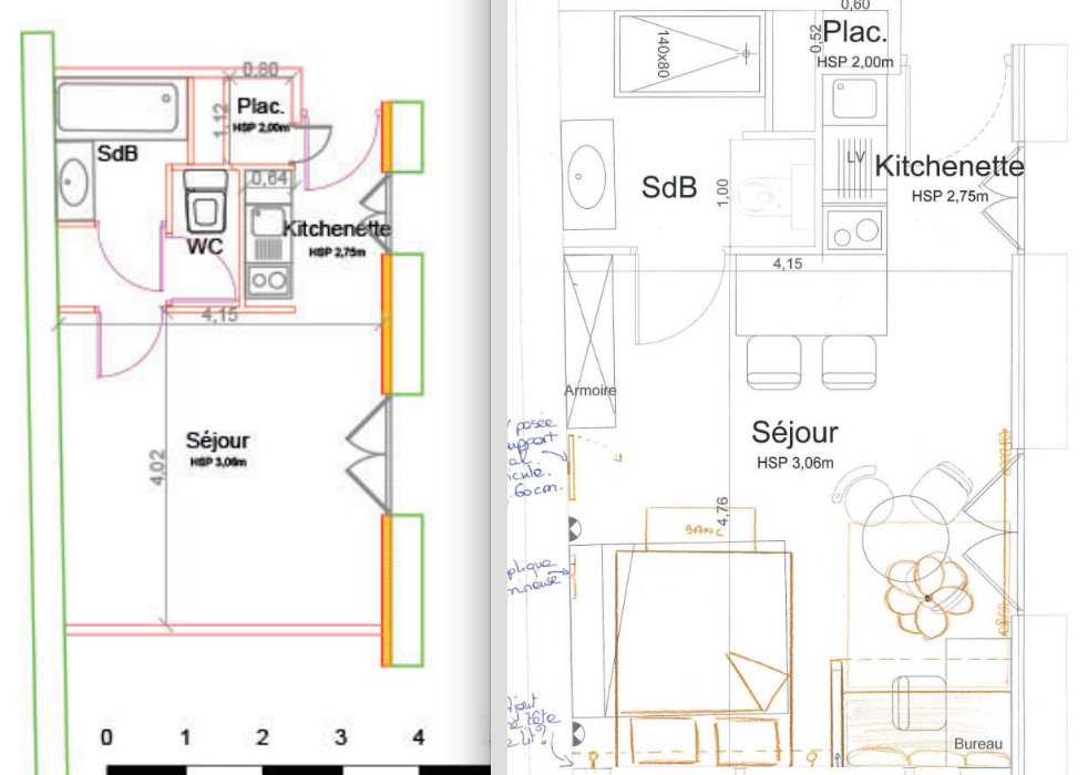 Plan avant travaux (à gauche) et plan après travaux (à droite)