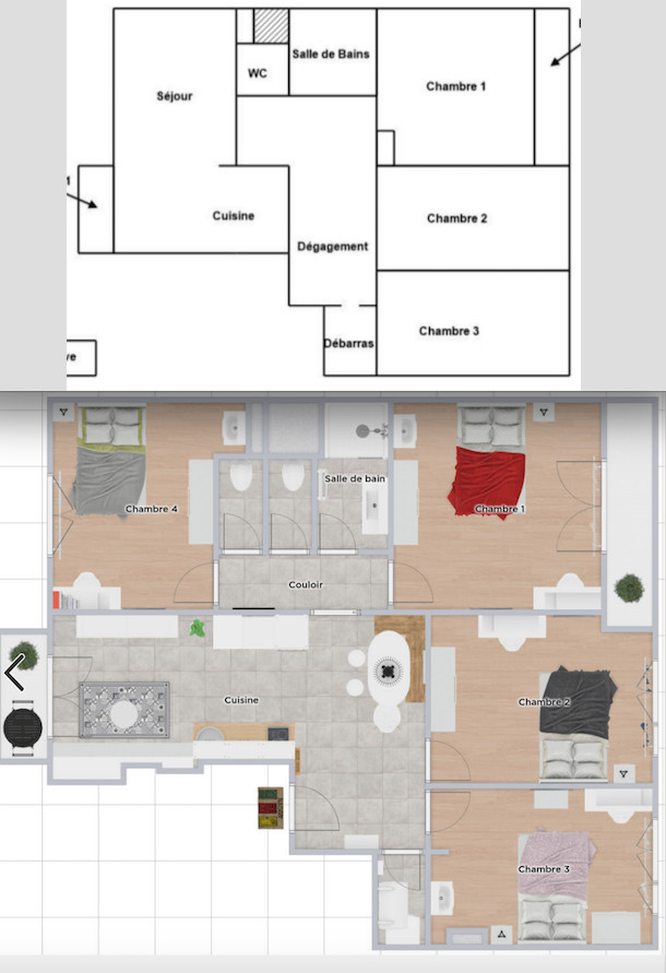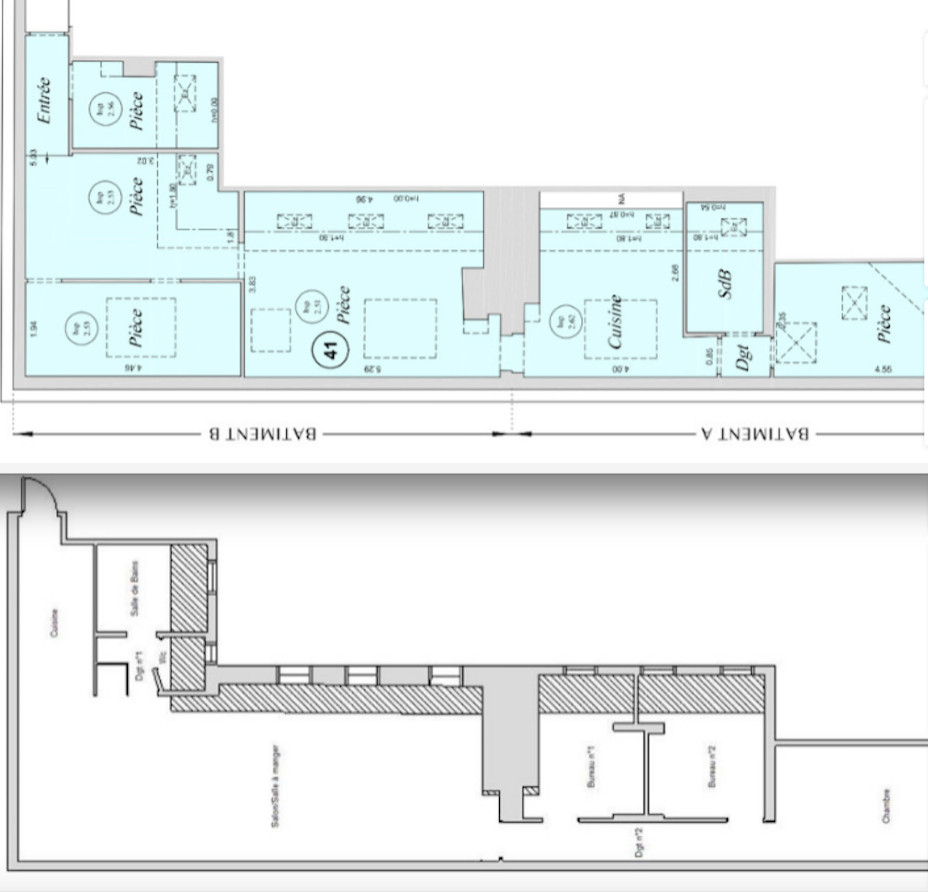 Plan avant travaux (en bas) et plan après travaux (en haut)
