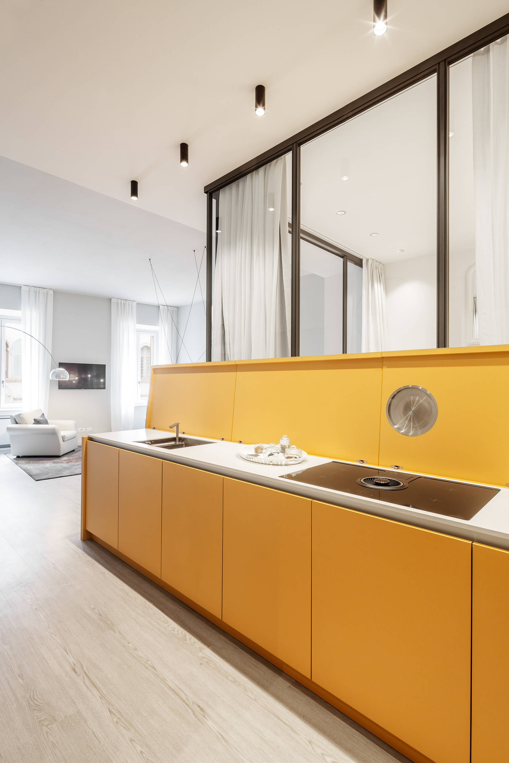 Certains professionnels de l’aménagement manient l’art de l’esquive. À Trente, en Italie, dans cet appartement aménagé pour les vacances par le studio d’architecture Raro, la cuisine prend la forme d’une console d’entrée filante. La surprise est de taille lorsque s’ouvre le top de ce meuble sur mesure pour laisser apparaître les fonctions nécessaires à la cuisine, y compris la hotte intégrée.