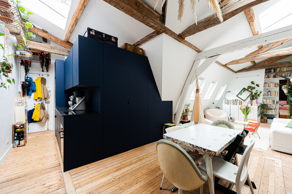 Lors du réagencement de ce 74 m² sous les toits tout en longueur, le placement de leur cuisine a été le principal sujet. Un emplacement classique, tourné vers la salle à manger, avait été d’abord envisagé avant qu’ils ne la placent plutôt dans le couloir d’entrée.