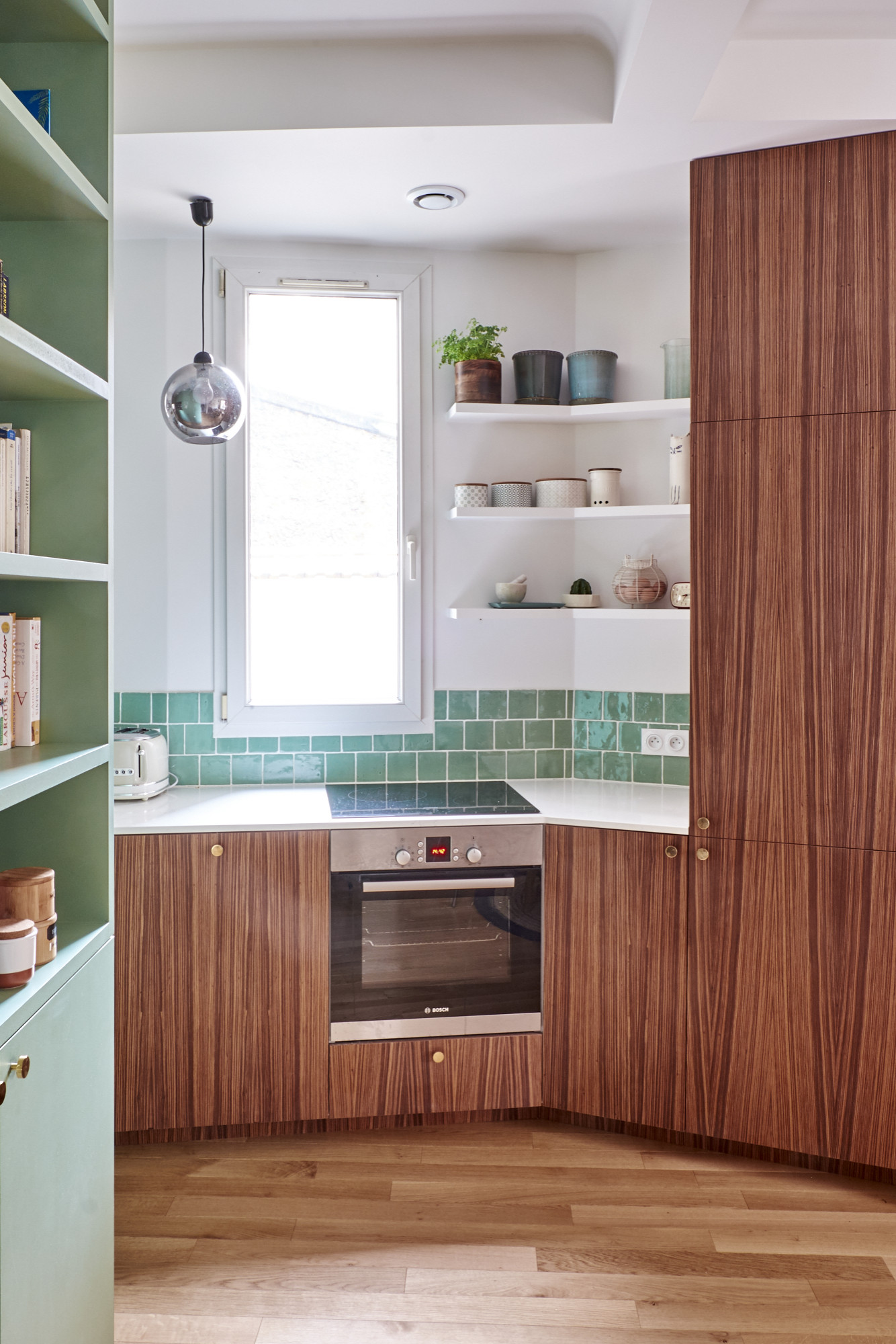 Assumer cette place originale est passée par l’adoption d’un design haut de gamme pour la cuisine, parée de magnifiques façades en bois veiné et rehaussée par une crédence mentholée, façon zelliges. Ce qui était auparavant un simple couloir est désormais rempli de vie à l’heure des repas. En prime, installer comme ici des modules de cuisine en parallèle est toujours très efficace pour cuisiner car ce plan limite les déplacements inutiles.