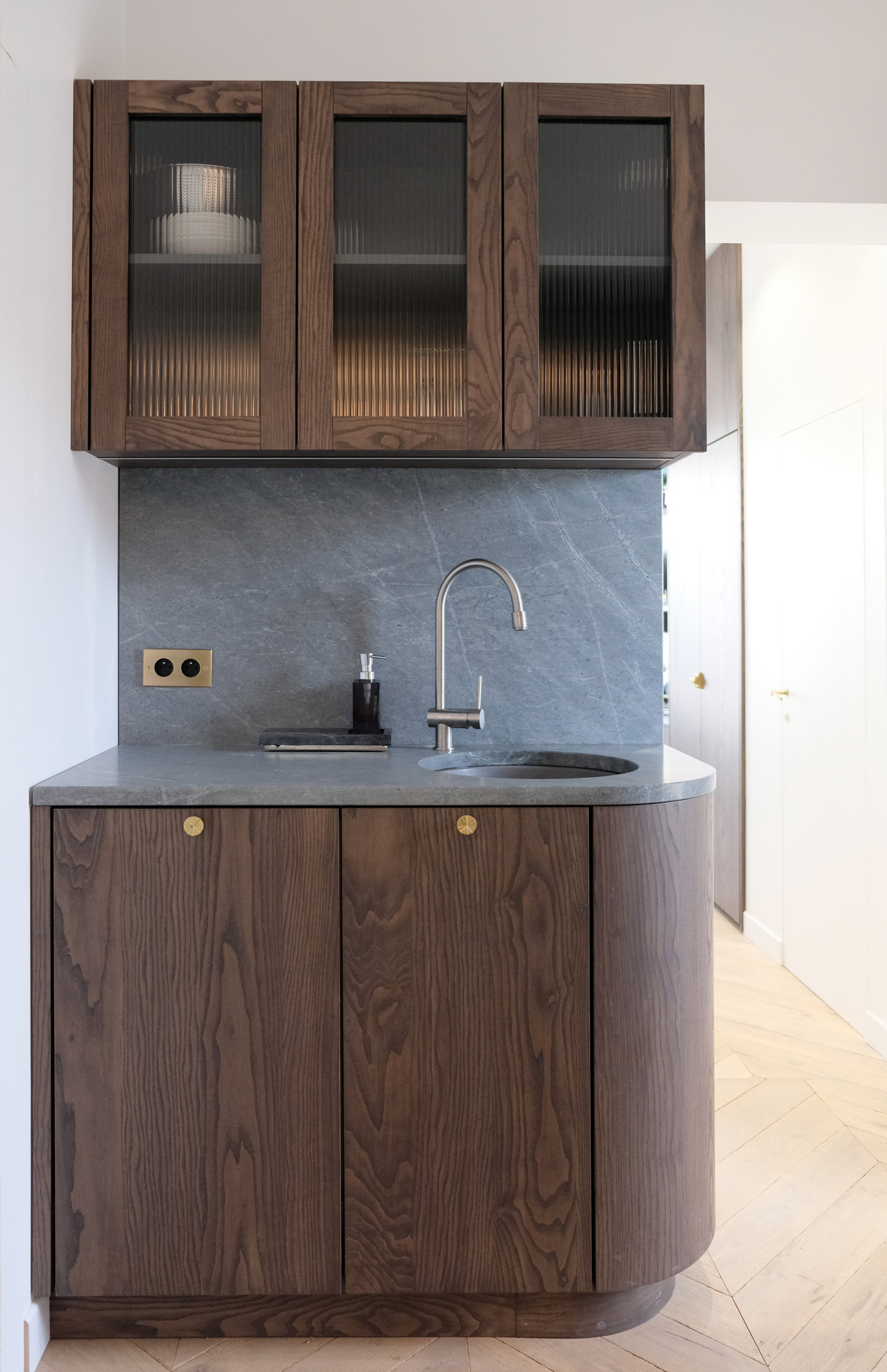 Deux linéaires – l’un avec les fonctions cuisson et conservation et l’autre avec fonction lavage – se sont répartis de chaque côté de la circulation. Et une fois de plus ont été revêtus de beaux atours, en chêne teinté façon noyer et quartzite Atlantic Lava Stone. Bien vu les meubles cintrés au niveau des passages de portes, de sorte à fluidifier la circulation !