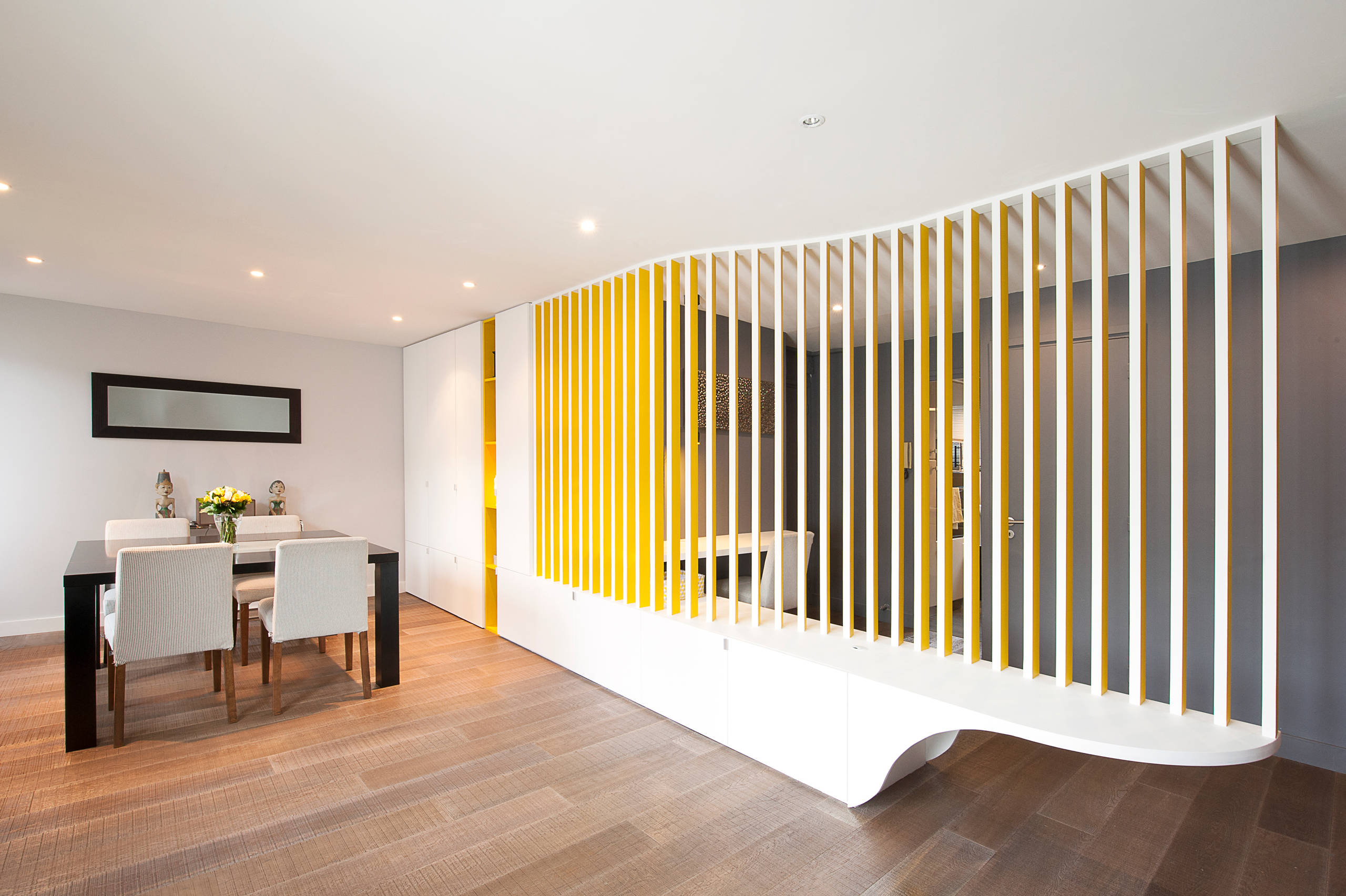 C’est une véritable œuvre d’art qu’ont créée ici les talentueuses architectes Karine Martin et Gaëlle Cuisy. Séparatrice d’espace, cette « paroi filtre ondulée » fait toute l’originalité de cette pièce qui aurait été sans cela plutôt impersonnelle. La structure matérialise le cheminement du couloir mais apporte aussi de la lumière avec sa couleur jaune sur une des faces, de la fonction avec un banc intégré, et surtout un effet graphique qui sublime l’espace.