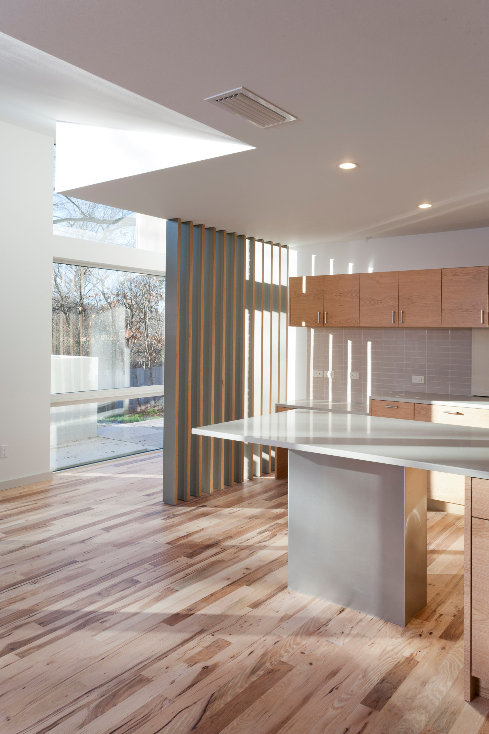 Voici la solution retenue par les architectes de Webber + Studio pour matérialiser l’espace sans le fermer. Ces lames de contreplaqué de bouleau de Russie, stratifiées sur une face, sont fixées au plafond et au sol de manière indépendante.