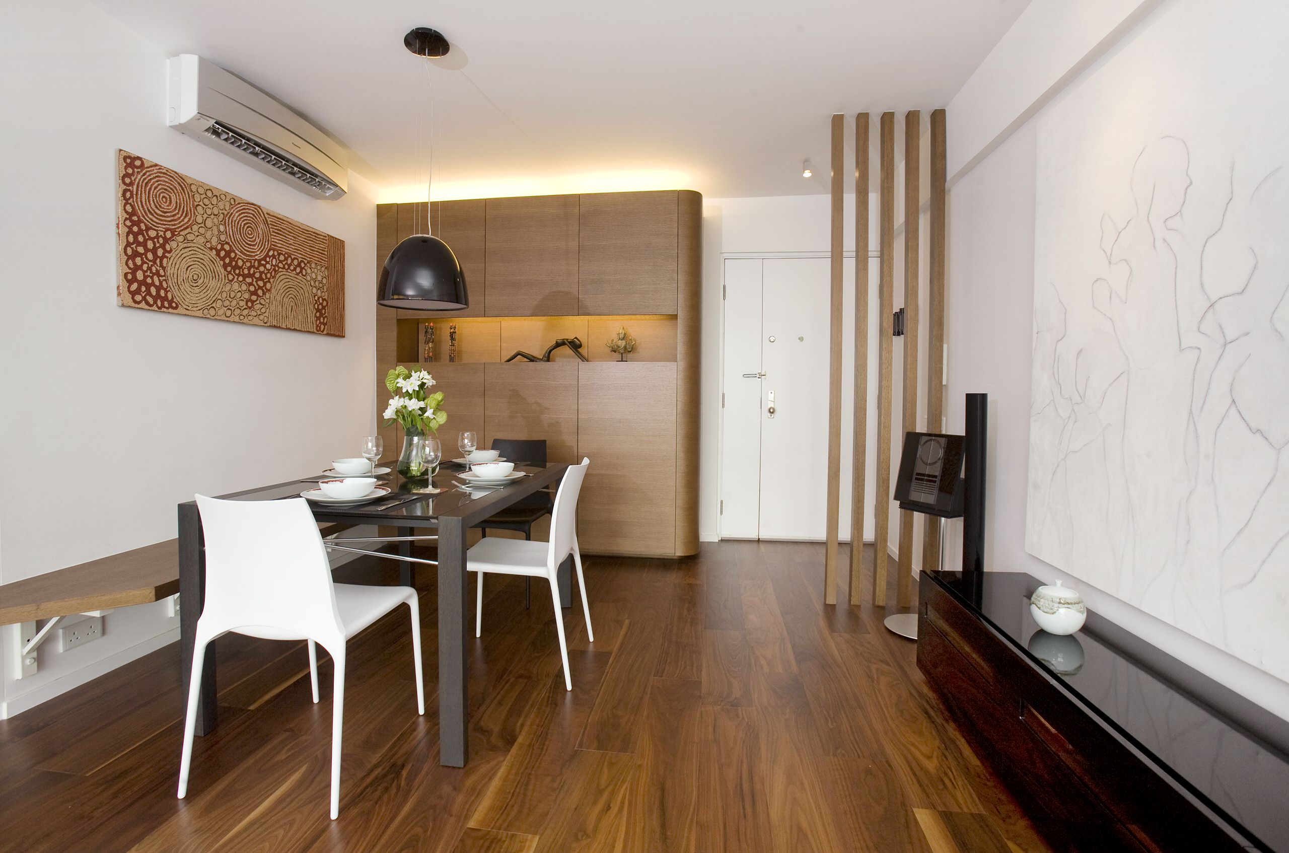 Dans ce salon, la cloison en lames de bois est mise en abyme : chaque grande lame est elle-même composée de petites lames dont il découle un effet graphique intéressant. Doublé d’un aspect pratique puisque ce séparateur d’espace peut pivoter et cloisonner réellement la pièce.