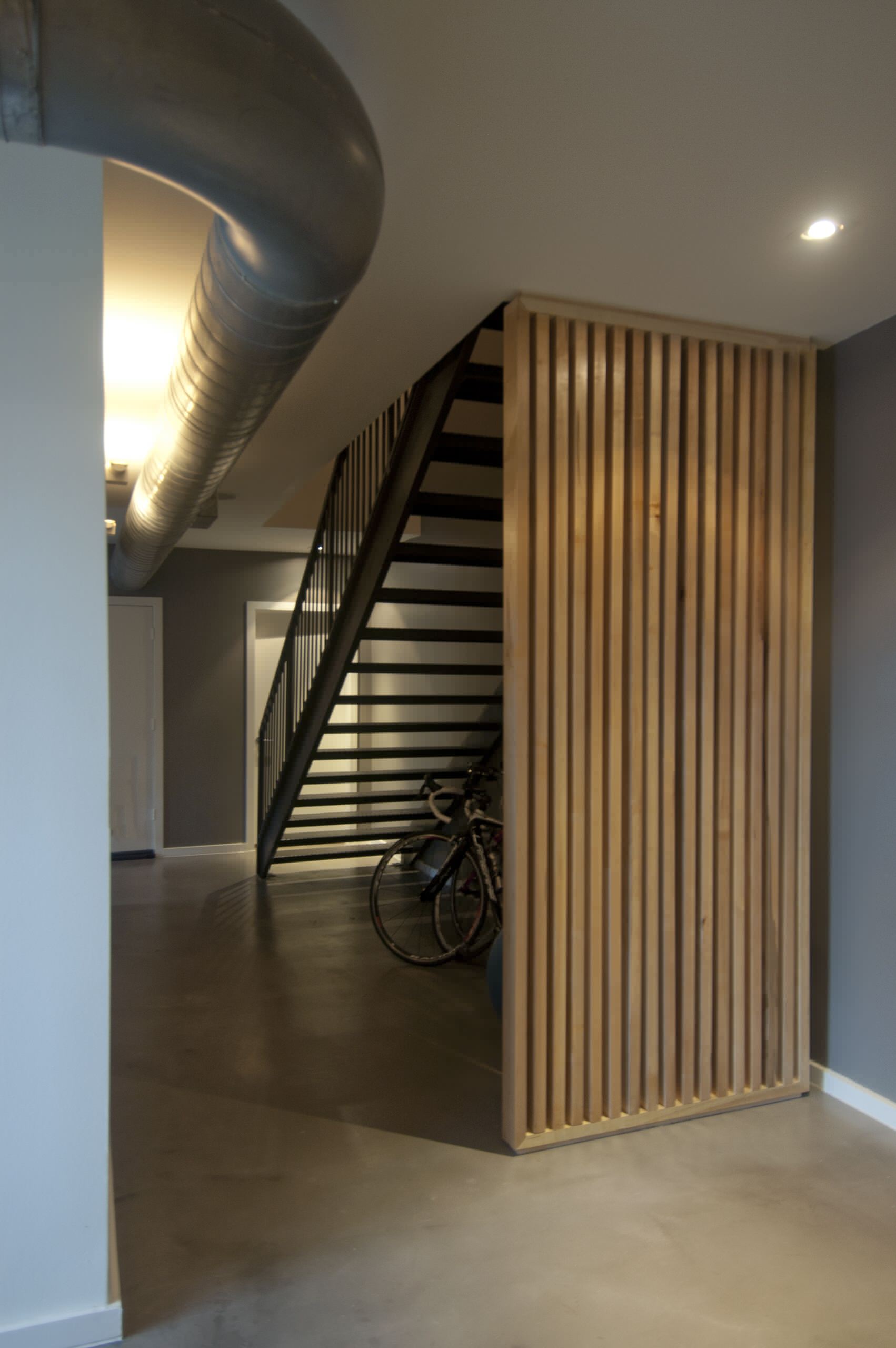 Quand on utilise ce système ajouré à base de lames de bois, il est important à mon sens de les fixer indépendamment au plafond et au sol, comme précédemment, et non au moyen de tasseaux haut et bas. L’encadrement apporte fatalement un sentiment de confinement qui contrarie l’effet design recherché.