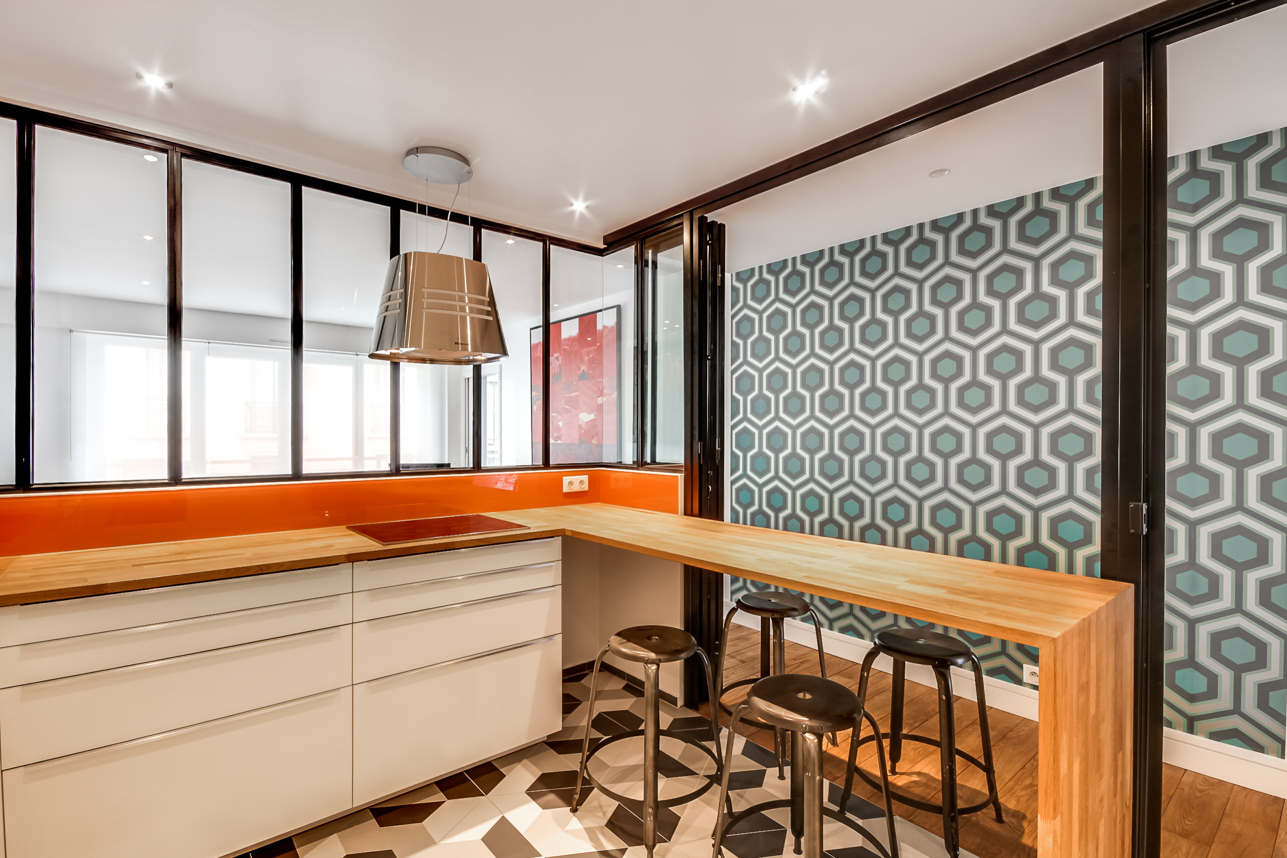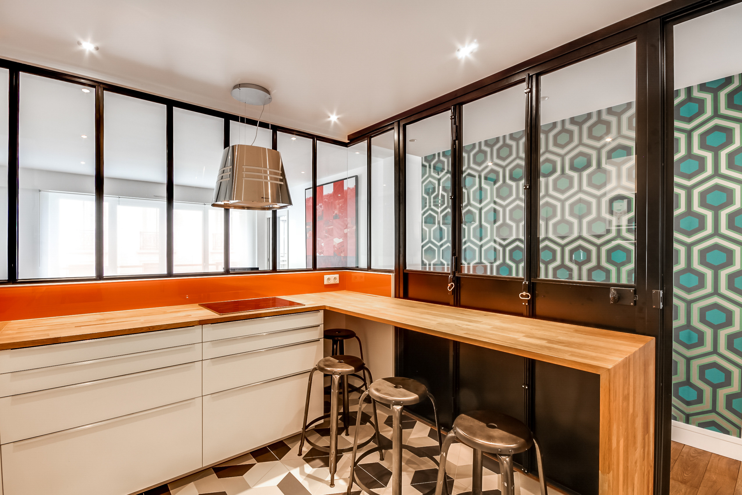 Astuce : Dans ce petit appartement, il a fallu réorganiser l’espace et l’optimiser. Ainsi, le salon a trouvé sa place côté lumière naturelle, tandis que la pièce sans fenêtre, à l’opposé, devient cuisine. En installant de jolies verrières atelier, on a permis de faire entrer la lumière du jour dans cette zone aveugle et de lui donner une vraie fonction.