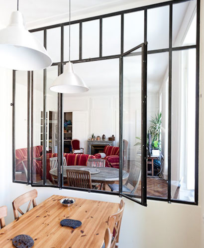 Vous rêvez d’une cuisine/salle à manger ouverte sur votre salon, mais malheureusement la structure de votre intérieur ne vous permet pas d’ouvrir votre espace. La verrière atelier pourrait vous aider ! Sans déposer la totalité de votre cloison et en respectant la statique du bâtiment, vous créerez une jolie transition entre la zone repas et la zone réception.