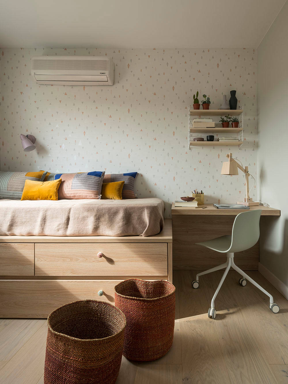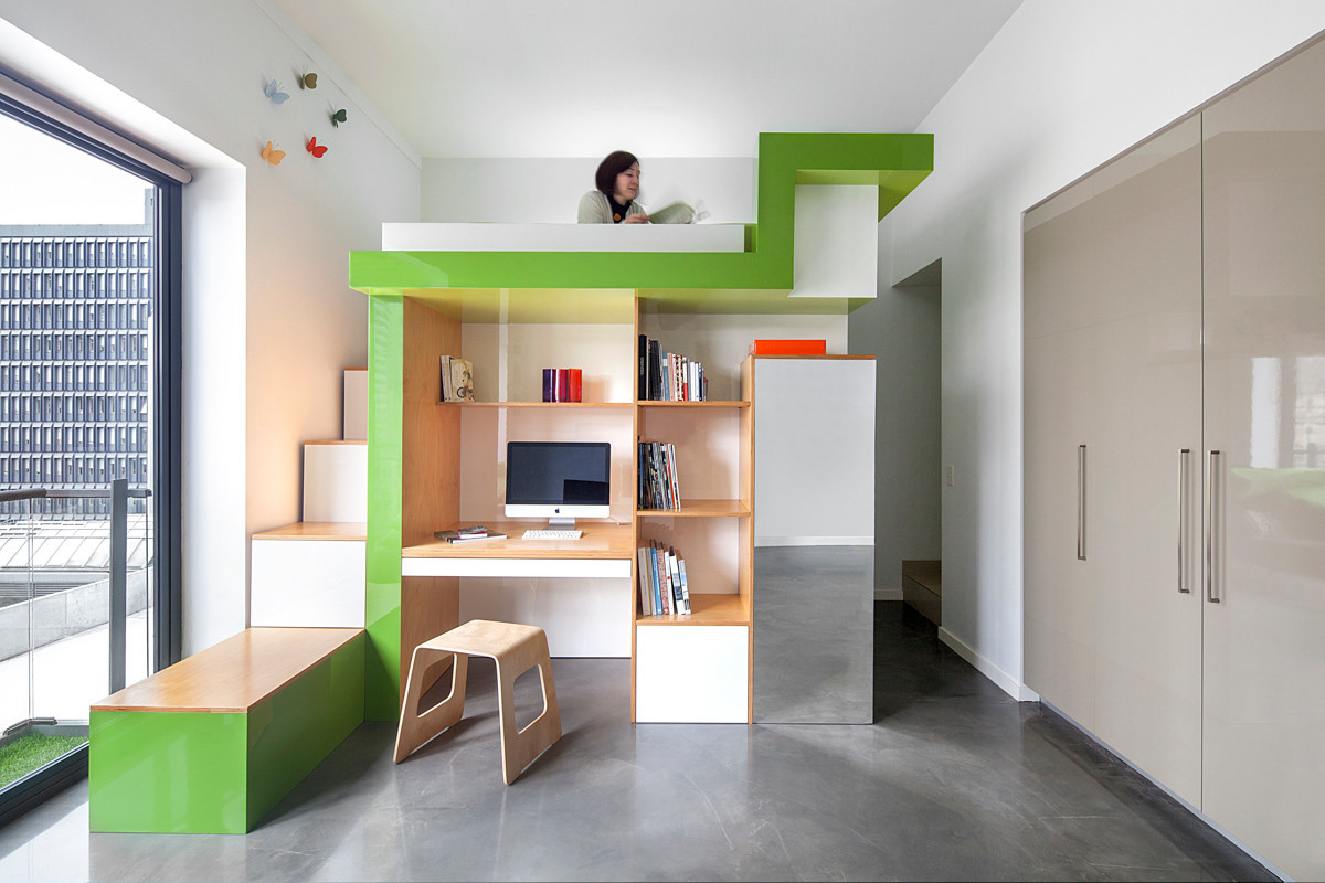 Écartons le sujet de la chambre d’enfant, qui est une pièce bien particulière : le bureau y trouve naturellement sa place. Les enfants passent sans cesse (parfois un peu trop vite !) d’une activité à une autre : jeux par terre, travail sur un bureau, lecture sur le lit… Il est donc nécessaire que tout soit regroupé dans leur chambre, avec des espaces distincts, mais imbriqués. Et les fabricants de mobilier pour enfants sont très inventifs pour proposer des solutions intégrées et modulables.