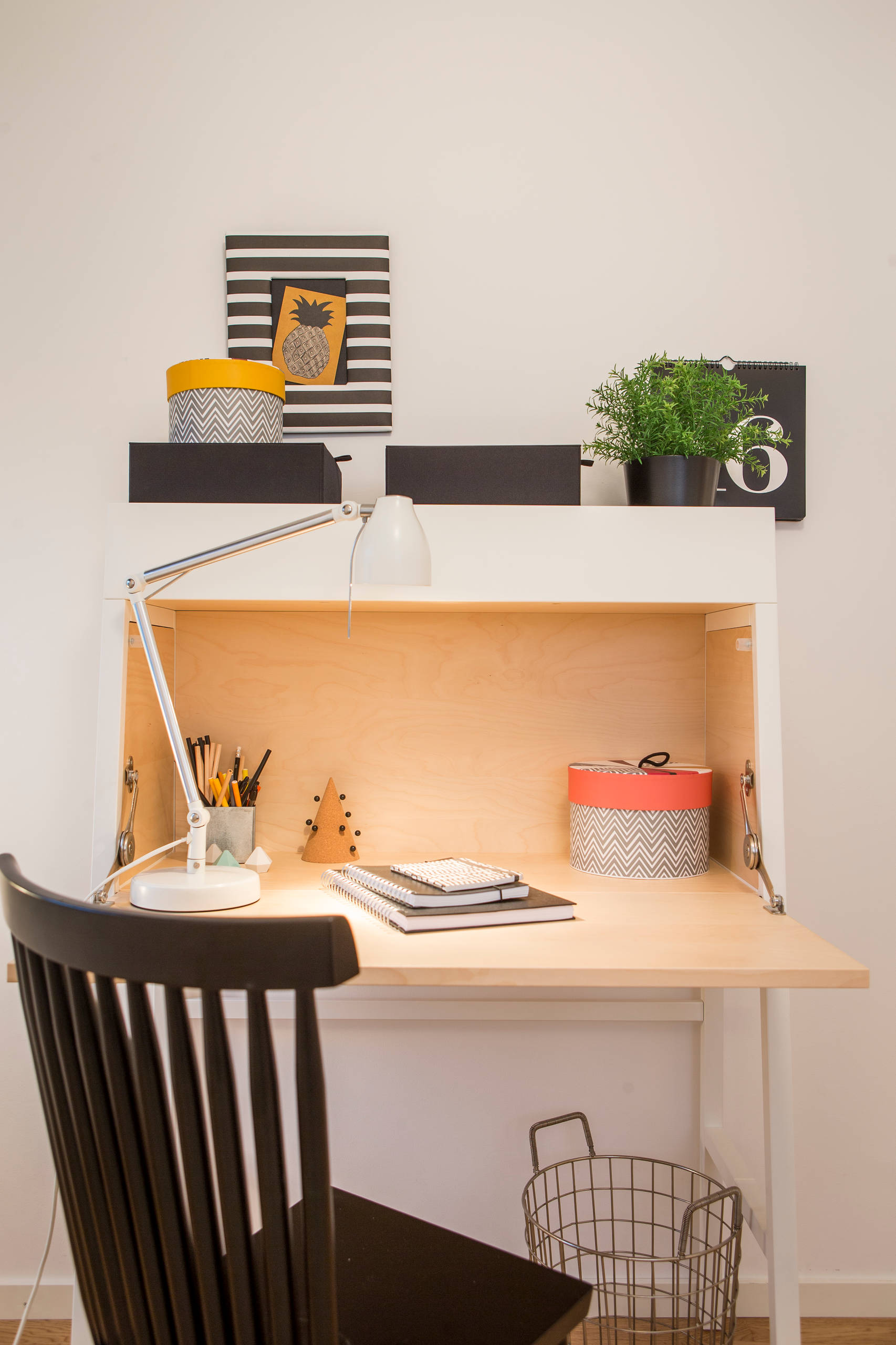 Et si je vous disais qu’une bonne idée consiste à créer un bureau escamotable dans un mur ? Vous profitez d’étagères intégrées dans un mur, et vous posez une grande tablette rabattable. Celle-ci, quand elle est abaissée, vous offre une table de travail. Et, une fois relevée, elle camoufle complètement votre bureau.