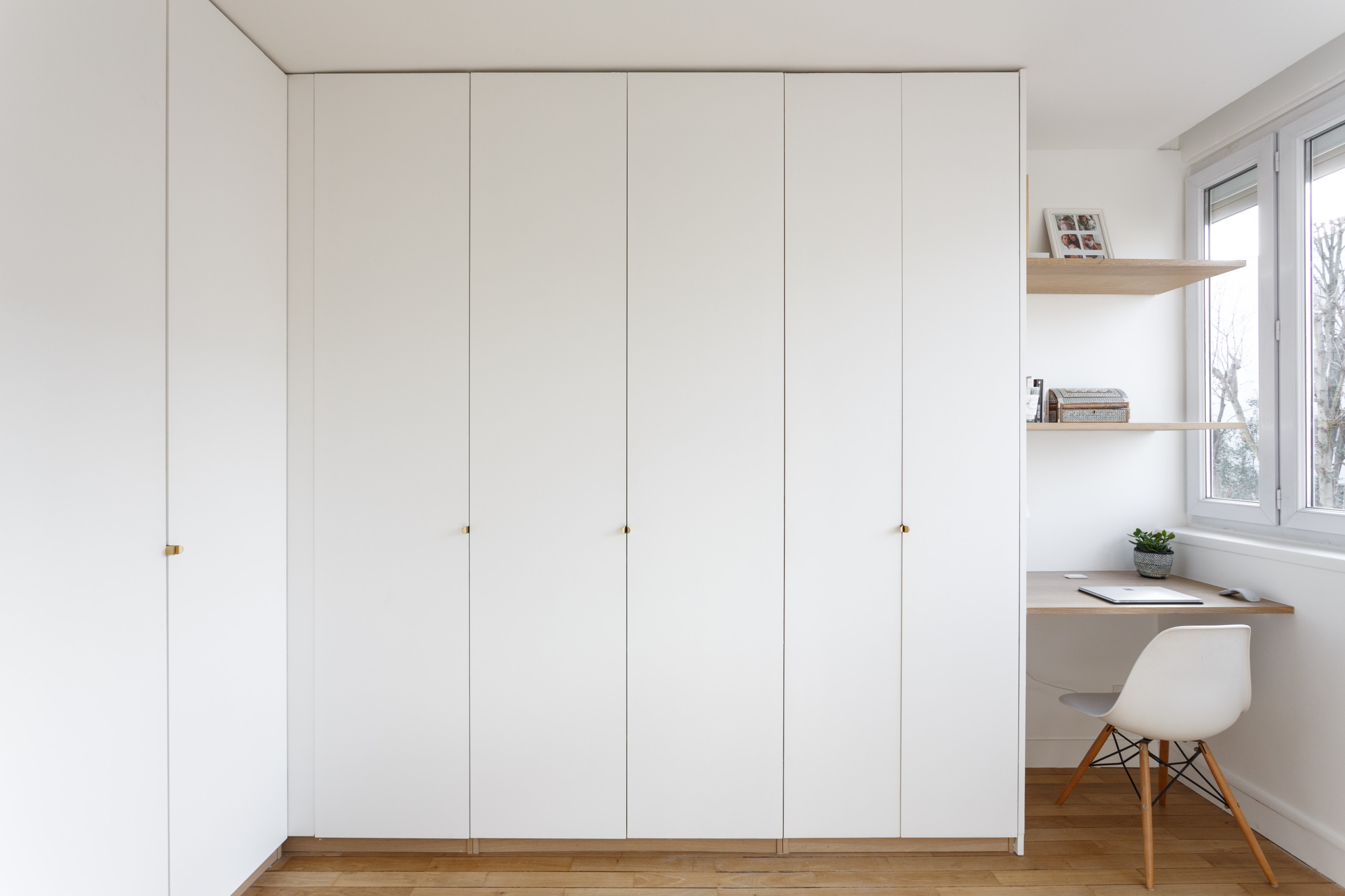 La version luxe de l’alcôve, c’est une petite pièce adjacente à la chambre, comme un grand placard, que l’on peut isoler avec des cloisons coulissantes. Des cloisons en verre permettront de faire circuler la lumière. Mais pensez au verre dépoli, pour profiter pleinement de cette solution, et ne pas laisser le travail empiéter sur vos nuits. Cette solution nécessite un bel espace, et la possibilité de dédier entièrement une partie de cet espace au coin bureau. La chambre est ainsi entièrement préservée.