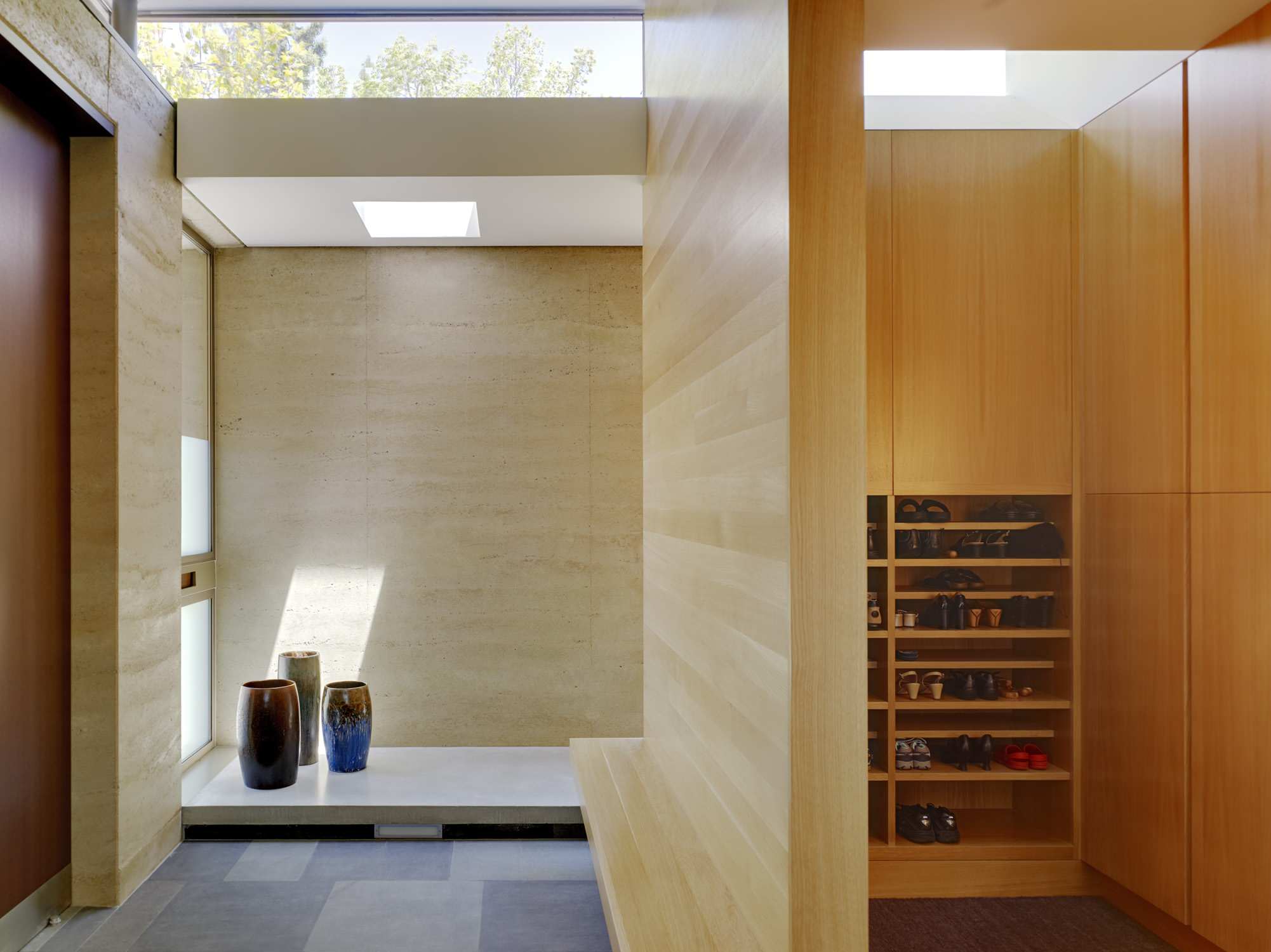 Par exemple, cette maison de Palo Alto, en Californie, possède des murs en pisé magnifiquement striés (dans le fond et à gauche de la photo) complétés par des cloisons en bois à panneaux horizontaux (sur le mur de droite).