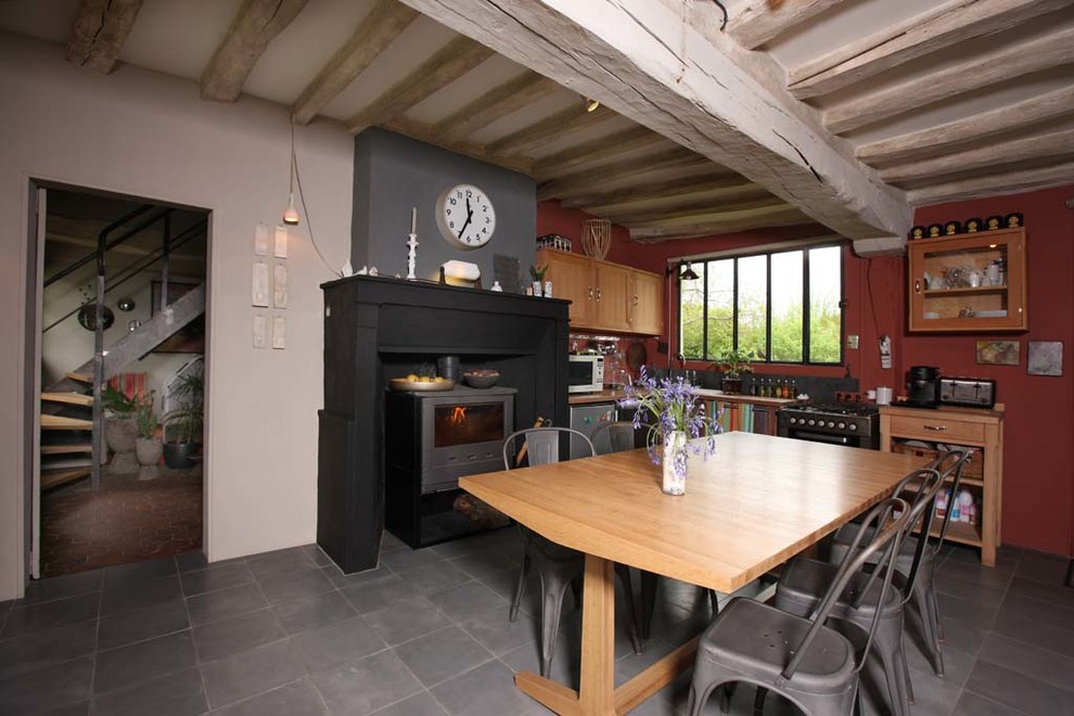 À l’époque où la longère était purement paysanne, elle pouvait être composée d’une seule pièce commune, où hommes et animaux cohabitaient. Autre organisation : une unité d’habitation et une étable accolée ou indépendante. L’espace intérieur s’organisait selon une succession de pièces en enfilade. Les équipements étaient très sommaires : une cheminée servant de four adossé au mur pignon, un évier à côté de l’entrée et quelques éléments de mobilier en bois pour manger et dormir. La hauteur sous plafond assez basse donne aujourd’hui une ambiance cosy et chaleureuse aux espaces.