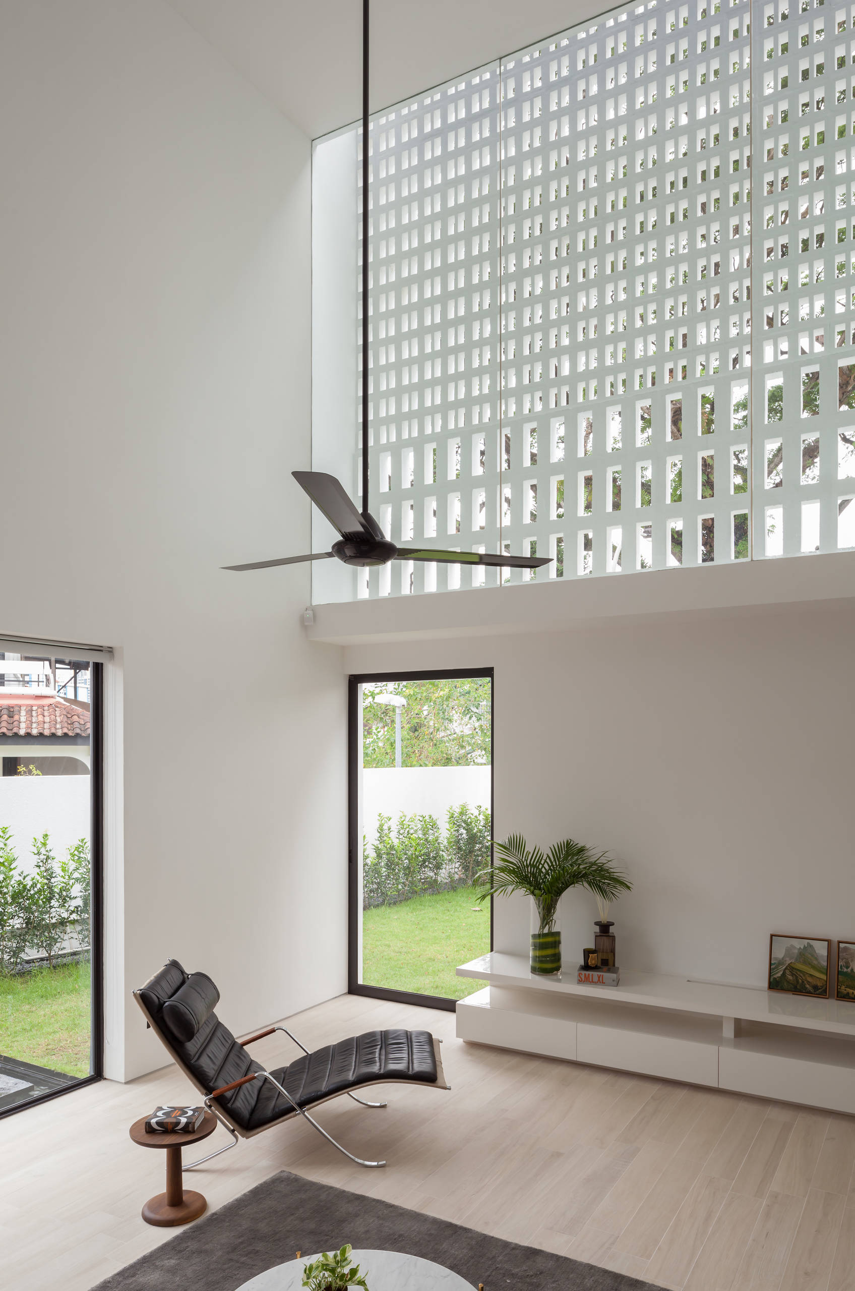 Derrière la grande bibliothèque, on découvre le salon et son plafond cathédrale. « L’écran blanc ajouré transforme les feuillages du parc en autant de pixels mouvants. L’espace change d’apparence au gré des jeux de lumière : celle provenant du côté du jardin, celle filtrée parvenant de la façade avant et celle de la fenêtre de toit juste au-dessus », commente Kelvin Lim.