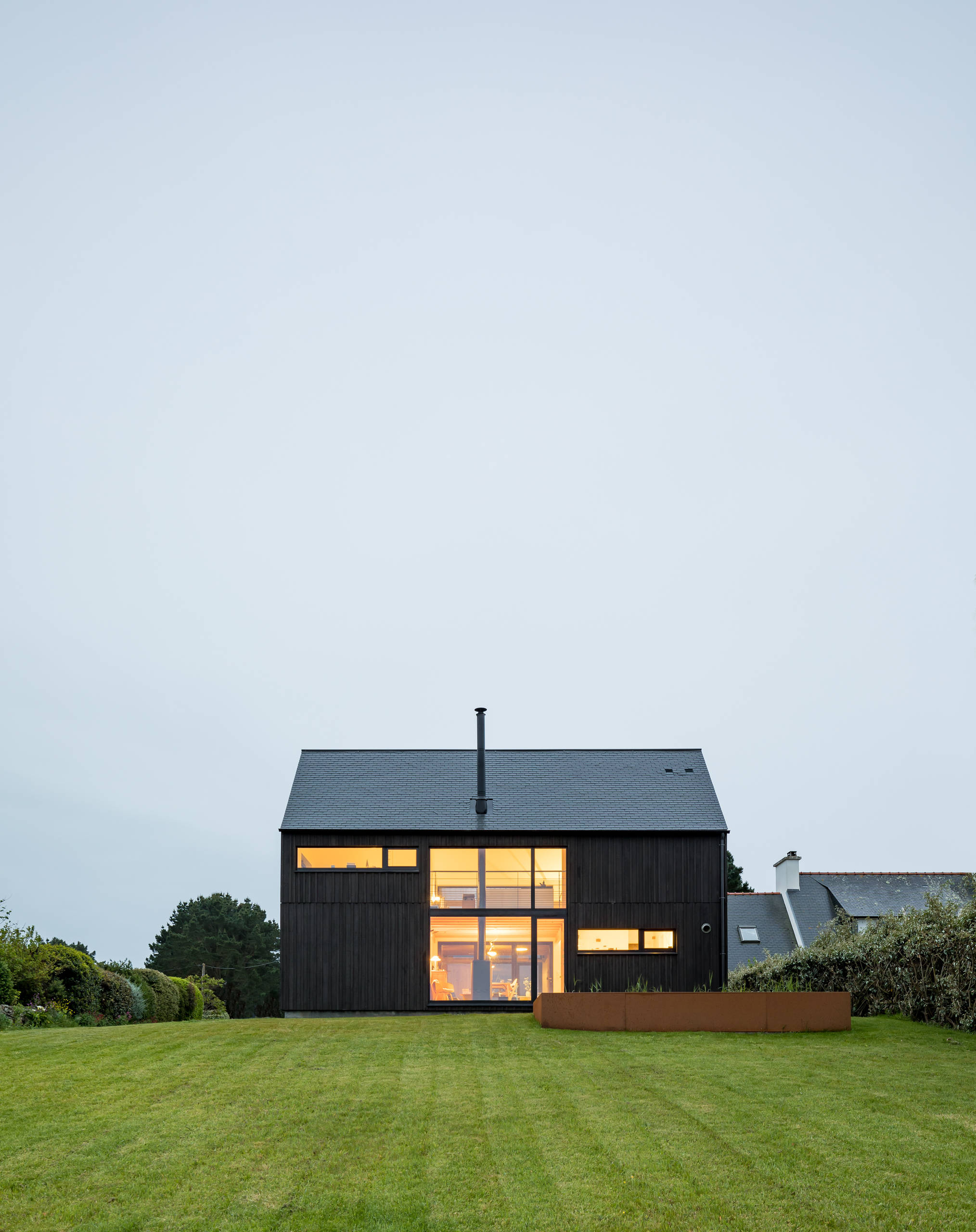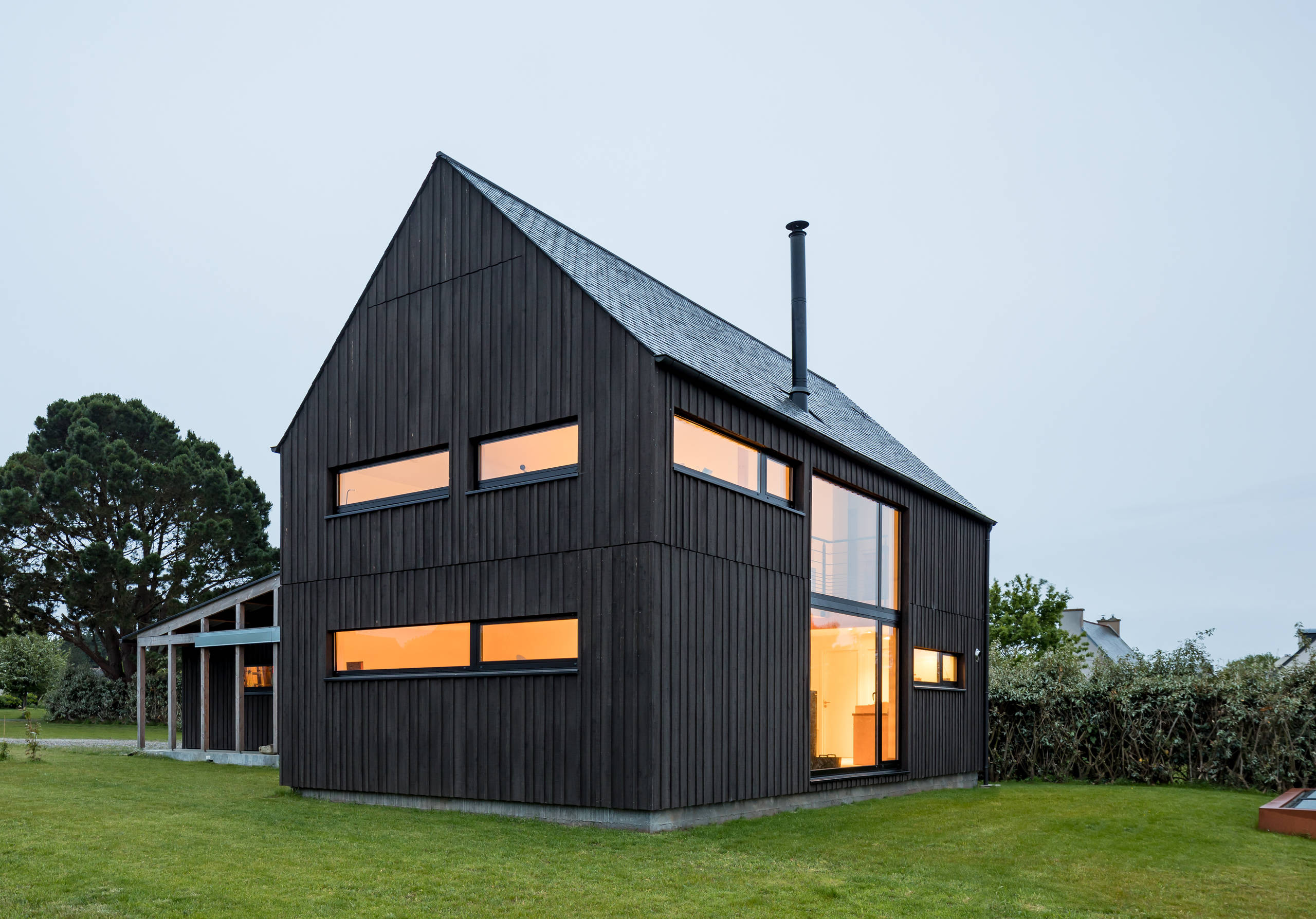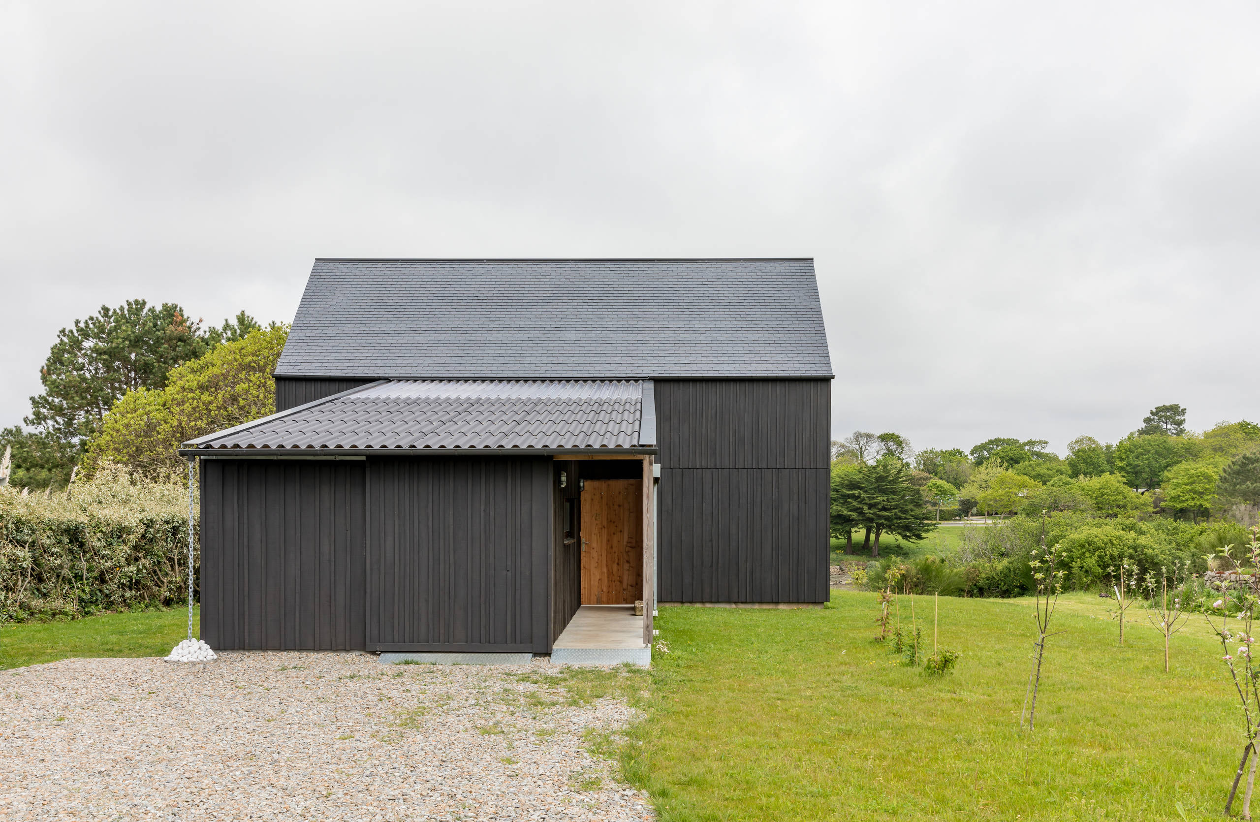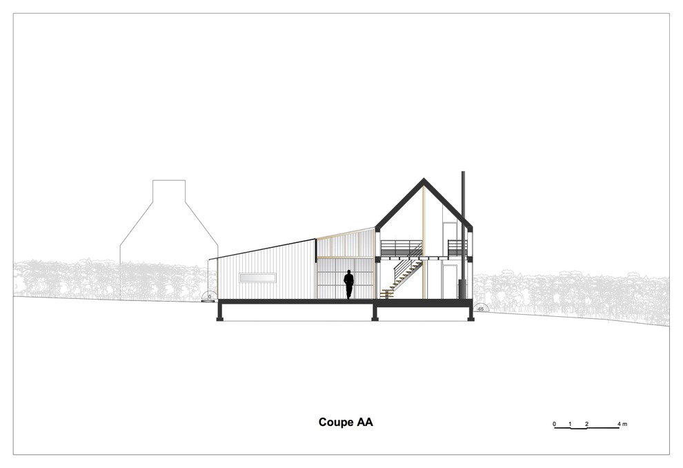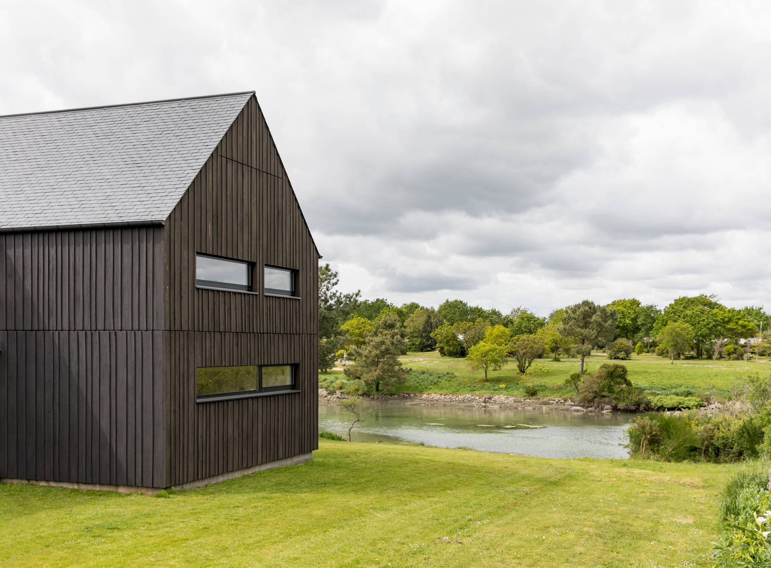 « Sur la côte du Finistère, on trouve beaucoup de bâtiments — notamment des cabanes de pêcheurs — habillés d’un bardage bois qui était à l’origine peint en noir de coaltar pour le protéger des intempéries. Ce matériau très polluant a été remplacé par des produits plus écologiques, comme le falun », explique l’architecte.