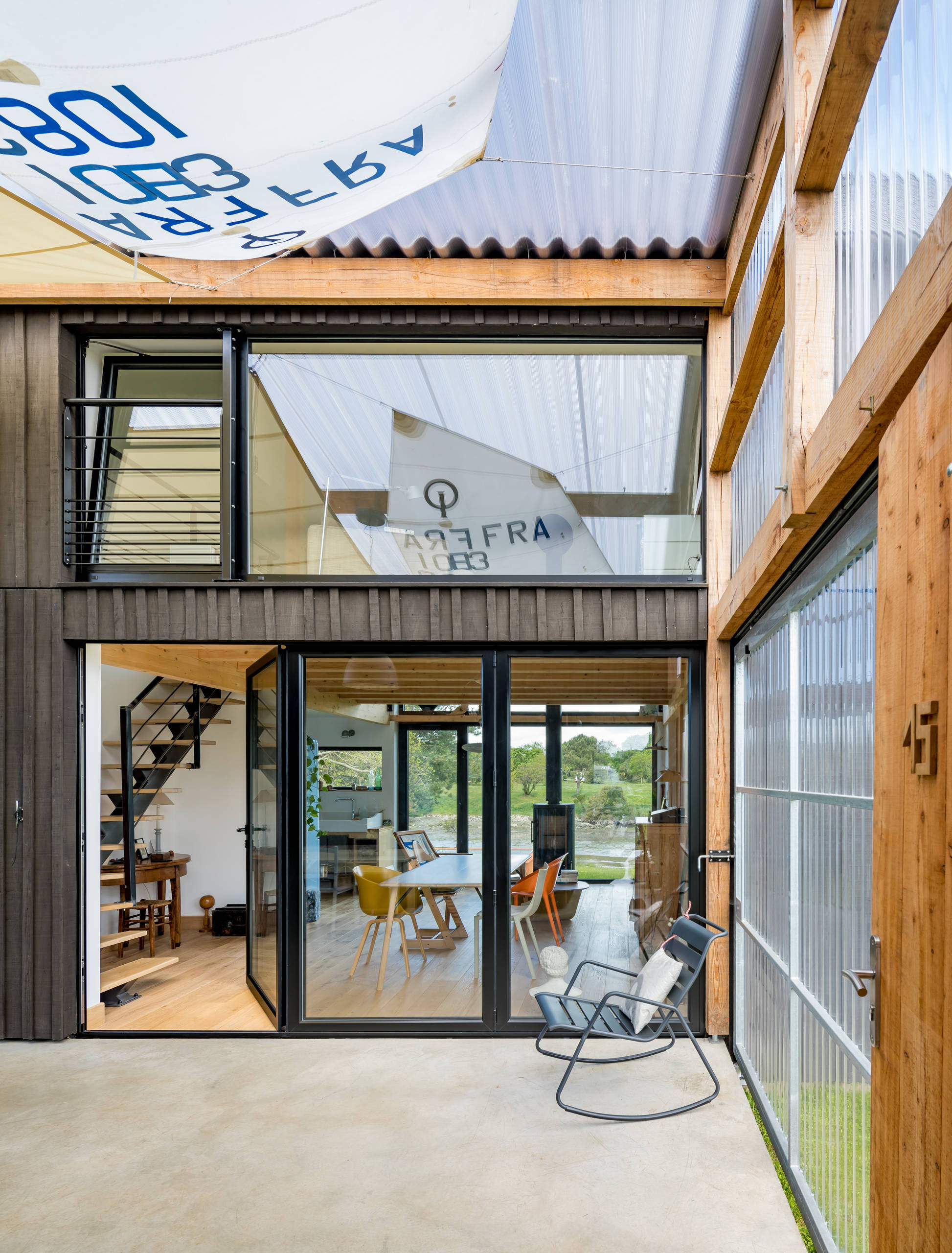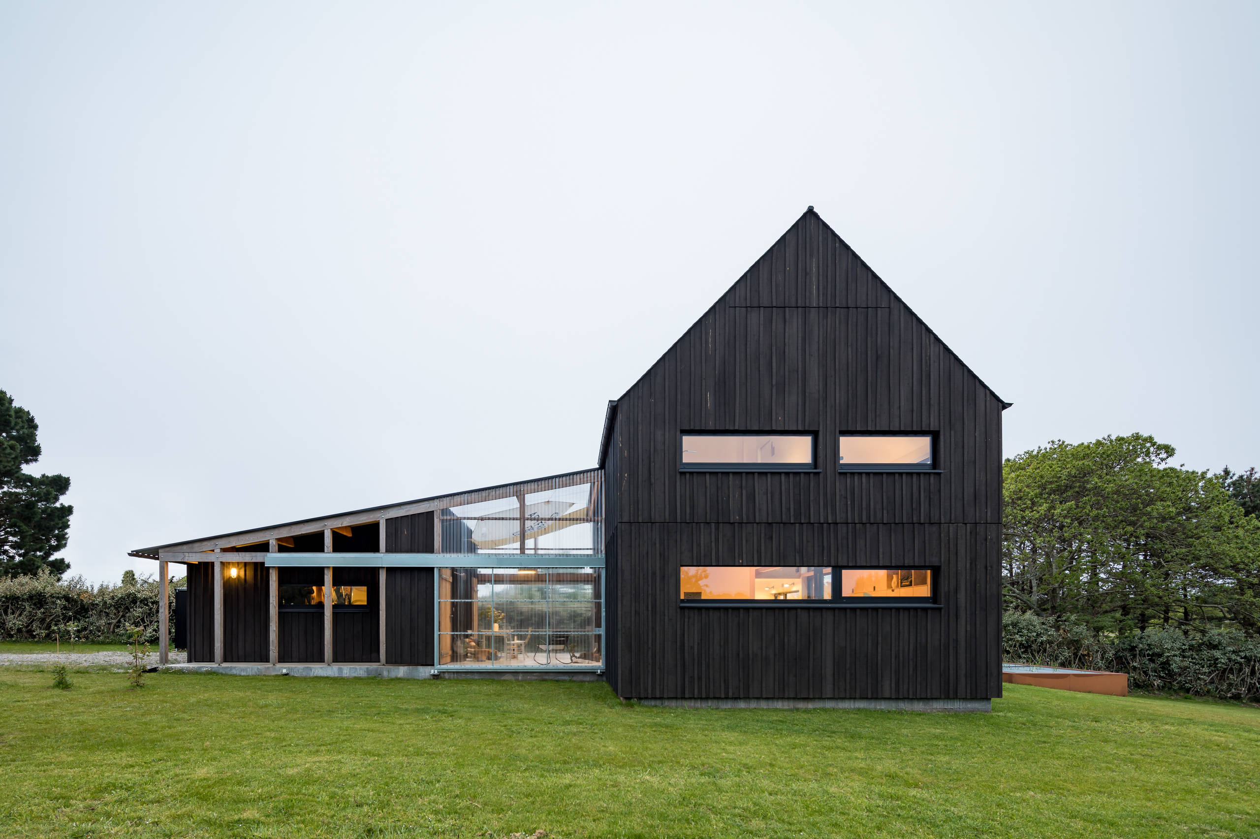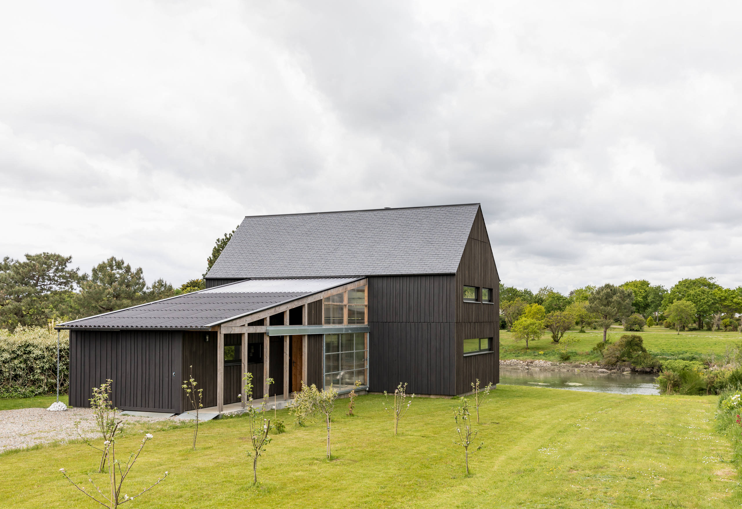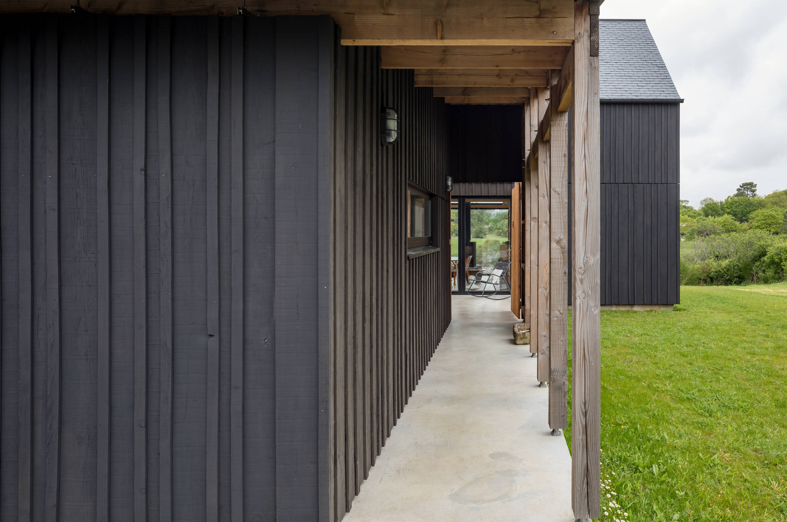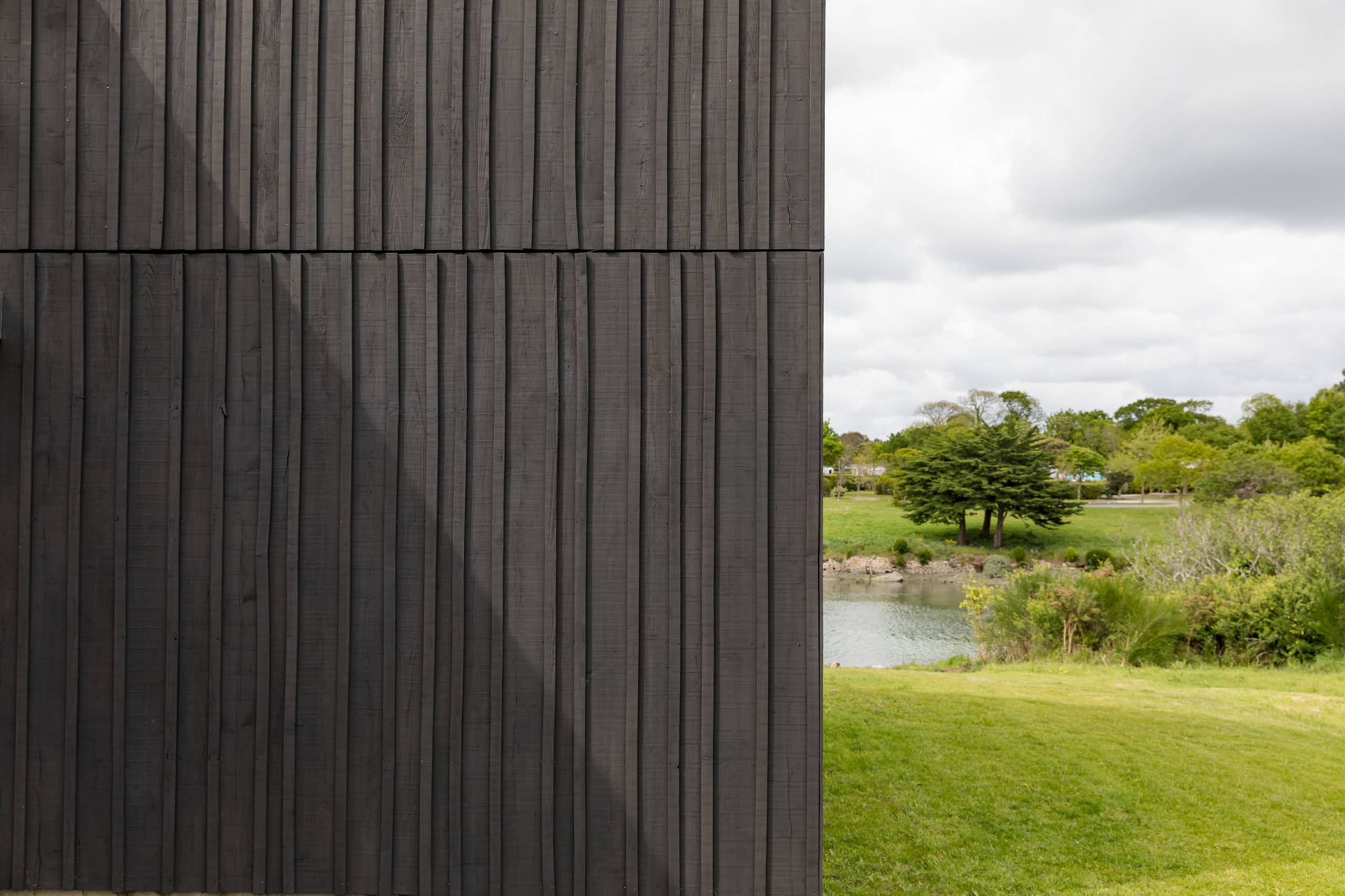 « Sur la côte du Finistère, on trouve beaucoup de bâtiments — notamment des cabanes de pêcheurs — habillés d’un bardage bois qui était à l’origine peint en noir de coaltar pour le protéger des intempéries. Ce matériau très polluant a été remplacé par des produits plus écologiques, comme le falun », explique l’architecte.